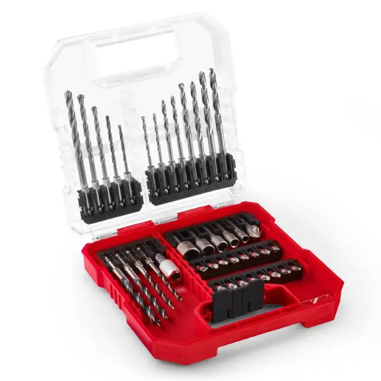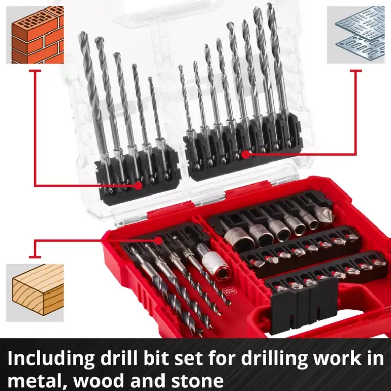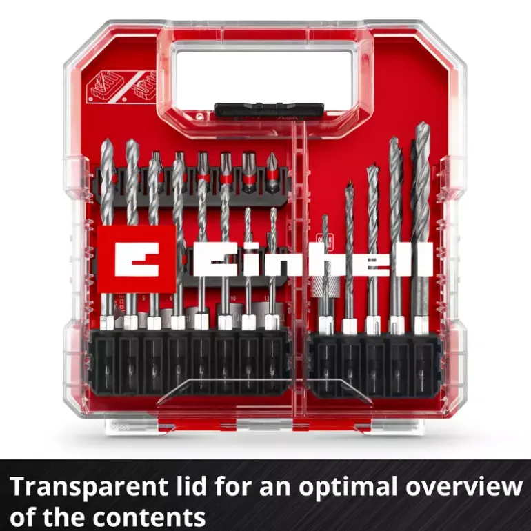 The 40-piece L-CASE from Einhell is suitable for all common drill chucks and bit holders in commercially available cordless screwdrivers and drills. This versatile bit and drill set is designed for a wide range of applications. The bit set contains 16 25 mm bits made of robust, grey sandblasted S2 steel with C 6.3 shank and PH1 / PH2 / PH3 / PZ1 / PZ2 / PZ3 / H3 / H4 / T10 / T15 / T20 / T25 / T27 / T30 / T40 / SL5 drivers. The 60 mm long quick-change bit holder made of carbon steel with E 6.3 shank, metal sleeve and strong magnet ensures quick and easy bit changes. Also included in the Einhell set are five sockets in sizes 5 / 6 / 8 / 10 / 13 mm with 1/4″ drive, made of CV steel. To improve grip and for extra durability, the grey sandblasted sockets have a satin finish with ribbing. The 12 mm countersink with E 6.3 shank is made of grey sandblasted, robust carbon steel. In addition, the L-CASE offers eight metal drill bits made of roll-rolled HSS steel with 135° split-point tip. The four wood drill bits are made of roll-rolled carbon steel and are equipped with a centre point for precise and easy drilling. Five masonry drill bits made of forged carbon steel with inserted carbide plate round off the Einhell tool set and are ideal for working in masonry, stone and concrete. The practical storage box of the bit and drill set in the special Einhell design provides organised storage space for all accessories. While the robust auto-lock clip closure ensures that the box is securely closed, the transparent lid allows an easy overview of the contents. This way, all components are always within reach. With its extensive selection of accessories, the 40-piece Einhell set is the perfect addition to any tool arsenal and enables reliable results in a wide range of applications.