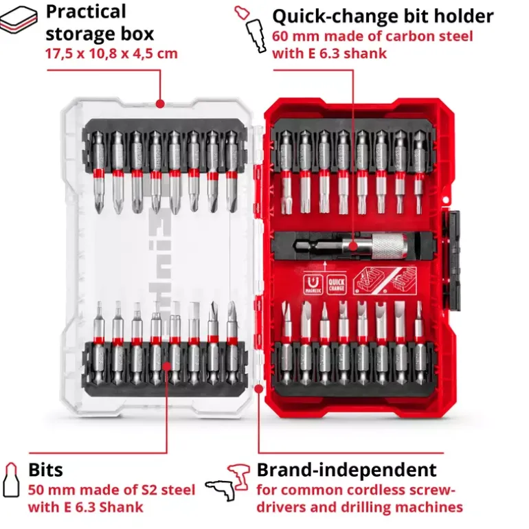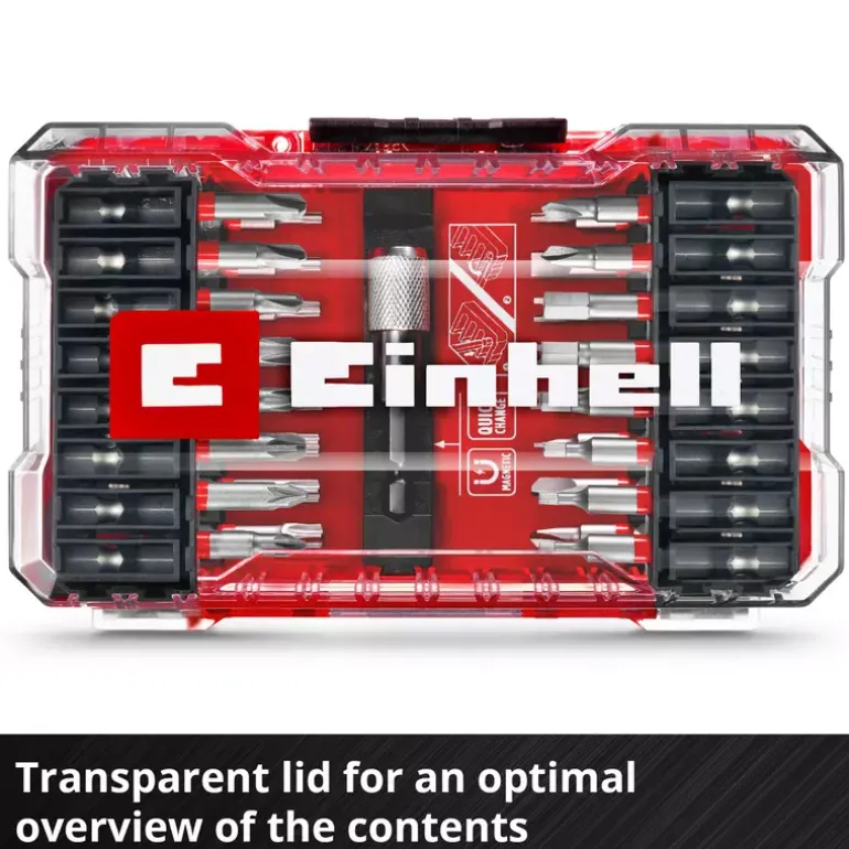 The 33-piece M-CASE from Einhell is a comprehensive bit set that offers both DIY enthusiasts and professionals a first-class assortment of different bits for numerous applications. The set includes 32 bits in 50 mm with E 6.3 shank and in the drives TT8, TT10, TT15, TT20, TT25, TT27, TT30, TT35, TT40 / BH2 / BH2.5 / BH3 / BH4 / BH5 / BH6 / PZ1 / PZ2 / PZ3 / PH1 / PH2 / SP4 / SP6 / SP8 / SP10 / TW1 / TW2 / TW3 / TW4 / TQ6 / TQ8 / TQ10 / SL6. They are made of grey sandblasted S2 steel and have a red coloured ring. In addition, the bit set includes a 60 mm quick-change bit holder made of robust carbon steel with a metal sleeve and an E 6.3 shank. With its strong magnet, it ensures quick and easy bit changes as well as a secure hold during use. This makes the Einhell set suitable for all common drill chucks and bit holders in commercially available cordless screwdrivers and drills. In addition to the high quality of the bits and the quick-change bit holder, the bit set is equipped with a practical storage box. This offers well-organised storage space and a transparent lid that makes it easy to see the contents at a glance. The robust auto-lock clip closure ensures safe storage and prevents unintentional opening during transport and storage. Overall, the tool set offers a versatile and exquisite selection of bits that can be used for a variety of projects and applications in home, garden and workshop. This makes the M-CASE an ideal addition to any toolbox.