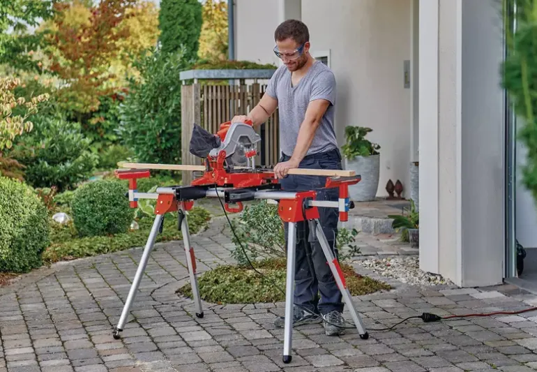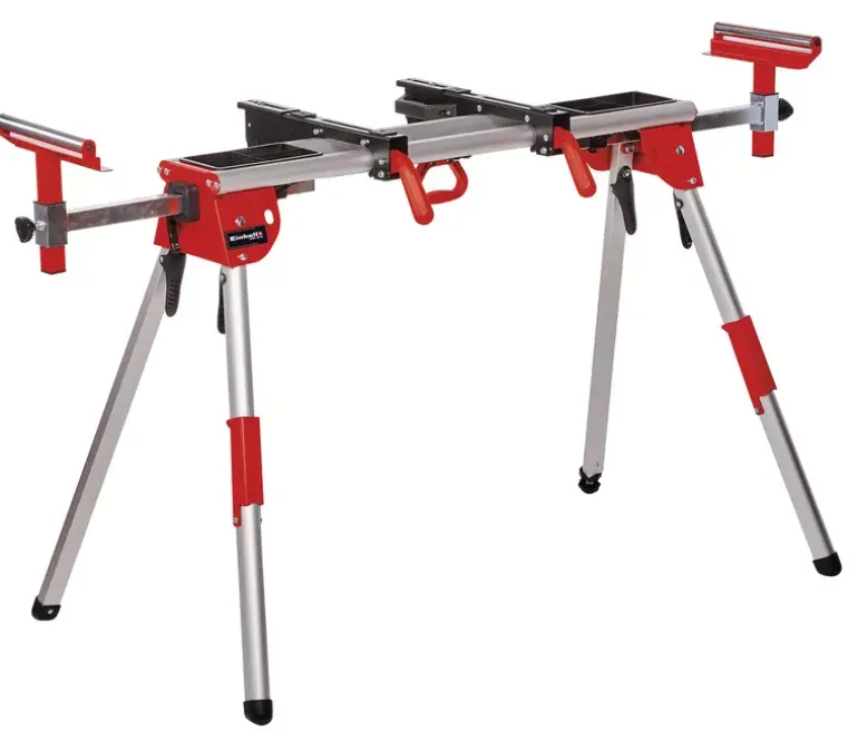 The Original Einhell underframe stationary saw accessory MSS 1610 makes your work stable and flexible: The stable, high-quality aluminium construction is ideal for stationary equipment such as mitre saws and (sliding) cross-cut mitre saws, making it easy to use and mobile. The extensions of the mounting rails make it possible to mount even larger mitre saws than usual with this underframe (mounting up to 455 mm). One of the feet is height-adjustable so that the underframe can be perfectly levelled on even or uneven surfaces. The various quick-release fasteners can be considered an immense help for setting up and dismantling your equipment. These include the quick-release fasteners for fixing the legs by means of pressure levers, which are easier to grip and also prevent fingers from getting caught in the locking member. On the other hand, the lateral table extensions are also equipped with a quick-fix function and do not have to be secured by turning a screw. The workpiece supports on the lateral extensions are equipped with easy-running rollers to protect the workpiece. Located on the front legs are 2 hinged supports, which can be used to deposit longer workpieces. Integrated into the main table there are also two storage spaces intended for various small parts such as screws or nails.