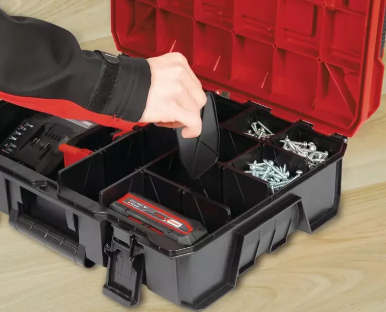 The Original Einhell plastic compartment set is an accessory for the Einhell E-Case system. The set offers greater flexibility for the cases with its additional plastic compartments. The set contains two long, three medium and four short compartments. The compartments enable the Einhell organisation system for accessories and attachments to be used with greater flexibility, for example for diverse drill bits or cutting attachments and for small polishing and sanding tools. The short compartments are ideal for nails and screws and all sorts of small parts The set is also suitable for the E-Case S-F with foam inlay in the lid.