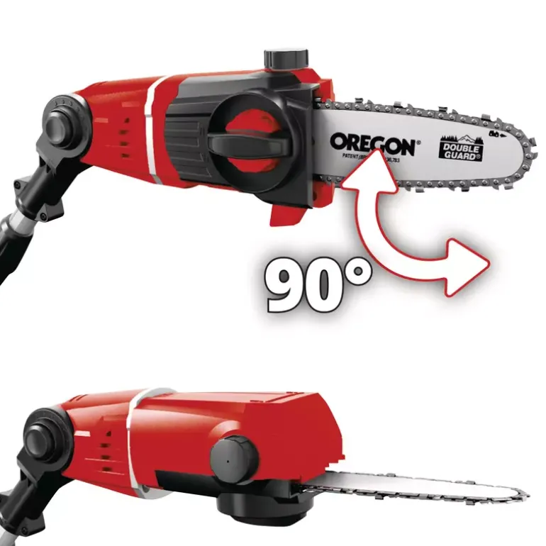 The Original Einhell pole pruner attachment has been specially designed as the perfect accessory for the cordless telescopic hedge trimmer GE-HH 18/45 Li T. When used in combination with the pole pruner attachment, the hedge trimmer becomes a 2-in-1 tool that can also be used as a pole pruner. The cordless pole pruner attachment works at a cutting speed of 3.76 m/s and features an Oregon quality guide bar and chain with a guide bar length of 20 cm and a cutting length of 17 cm. The 90° rotatable attachment allows horizontal to be made with ease. The chain can be replaced without tools, and the chain can also be adjusted without needing additional tools. The chain is automatically lubricated. The robust metal transmission ensures a long service life, and the bumper spike prevents the saw from kicking back uncontrollably. A sleeve is provided for safe storage.