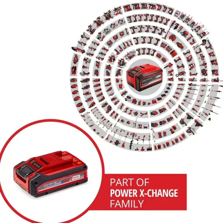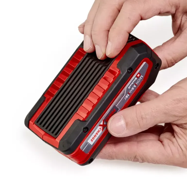 The Einhell 18V 3.0 Ah Power X-Change PLUS is a member of the multifunctional and completely interchangeable Power X-Change rechargeable battery system from Einhell. The Power X-Change rechargeable batteries can be used universally for supplying power and endurance to every cordless tool from the entire garden and workshop product family. The advantages to the customer are obvious: A single rechargeable battery and a single charger for all tools not only saves significant costs of buying, universal use helps protect the environment and provides flexibility in the home and garden too. It also eliminates the untidiness and chaos of having different rechargeable batteries and chargers for each separate tool. The latest generation of lithium-ion cells deliver 100% more power for maximum power in every application combined with a design which is 13% more compact with 10% less weight. What is more, the PLUS technology stands for extra power for energy-intensive jobs. In addition, the high-quality rechargeable battery resists the memory effect and the self-discharging normally associated with batteries, to deliver constant high power. The 18 V 3.0 Ah PXC PLUS is a high-end rechargeable battery from the Power X-Change family and is also suitable for TWIN-PACK use for 36 V applications. The ABS process-controlled active battery management system has a microprocessor for permanently monitoring the battery parameters. It therefore ensures maximum safety, optimum tool performance, maximum operating time and a maximum service life. The current charge level can be checked on a 3-step LED display. The housing is designed to be resistant to dust, corrosion and mechanical influences. The rubber coating provides high impact protection for the battery along with a good grip. There is a trough handle to enable it to be removed from each tool with ease.