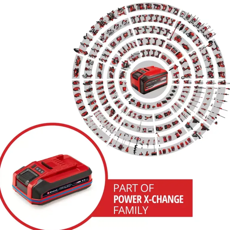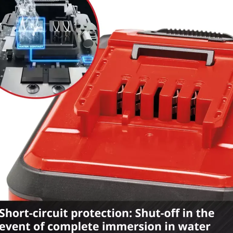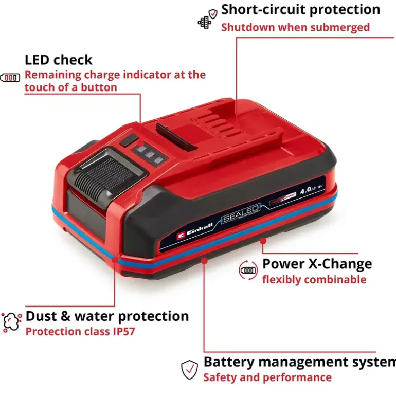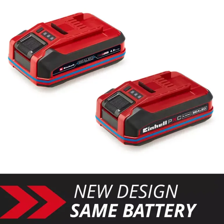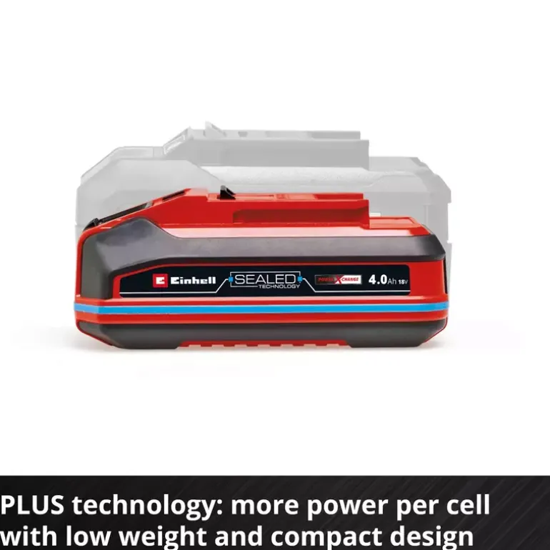 The Einhell 18 V 4.0 Ah SEALED Power X-Change PLUS is part of the multifunctional and infinitely combinable Power X-Change battery system from Einhell. The universal Power X-Change batteries provide power and endurance for all cordless power tools across the entire product family covering the garden and workshop sector. The special feature of the SEALED battery? Its sealed housing means it is waterproof and dustproof in accordance with protection class IP57. Thanks to the integrated short-circuit protection via an extra contact on the battery receptacle, the sensor system detects contact with water and switches off the electronics. This ensures that even if the battery has been completely immersed in water, it can continue to be used once it is dry. Its latest generation lithium-ion cells provide 100% more power for maximum performance in all applications, along with a 13% more compact design and 10% reduction in weight. In addition, our PLUS technology delivers extra power for intensive tasks. Furthermore, the high-quality battery does not suffer from the memory or self-discharge effects that most batteries do, meaning it can deliver consistent, high power. The 18-volt, 4.0 Ah Power X-Change PLUS is a high-end battery in the Power X-Change family, and is also suitable for TWIN PACK use in 36 V applications. The process-controlled ABS active battery management system continuously monitors the battery parameters using its integrated microprocessor. This ensures maximum safety, optimal device performance, maximum runtime and maximum service life. You can check the current charge status via the 3-setting LED indicator. The design of the housing makes it resistant to corrosion and mechanical impact. The rubber coating gives the battery high impact protection and ensures a good grip. Thanks to the recessed grip, it can be easily removed from all units. Comes without charger. This is available separately.