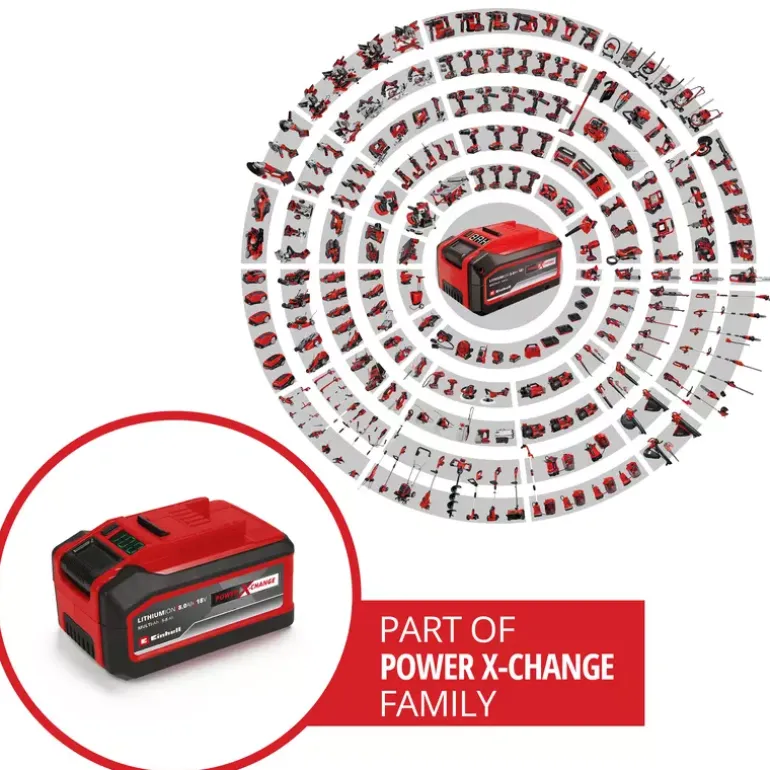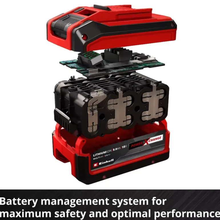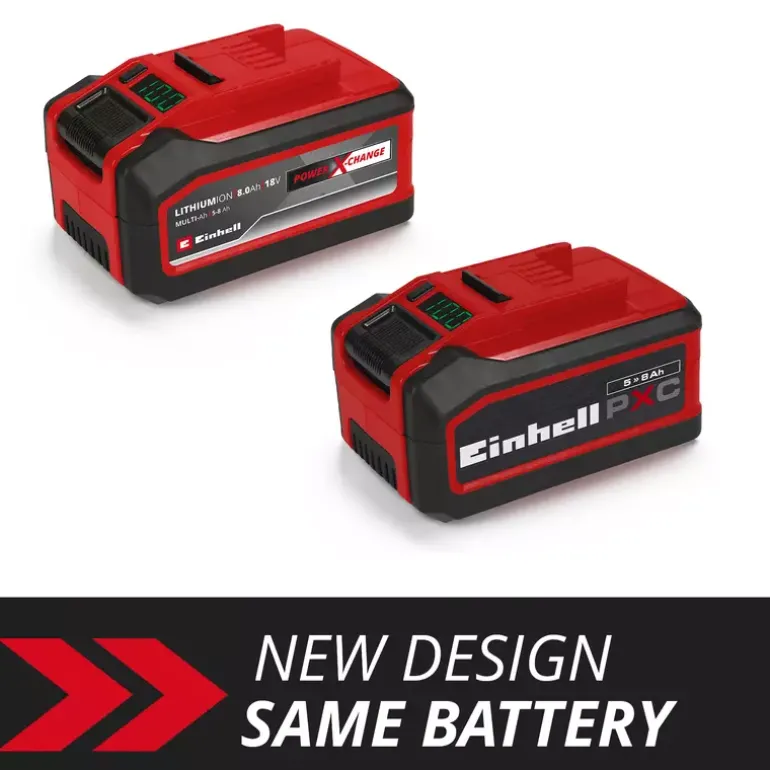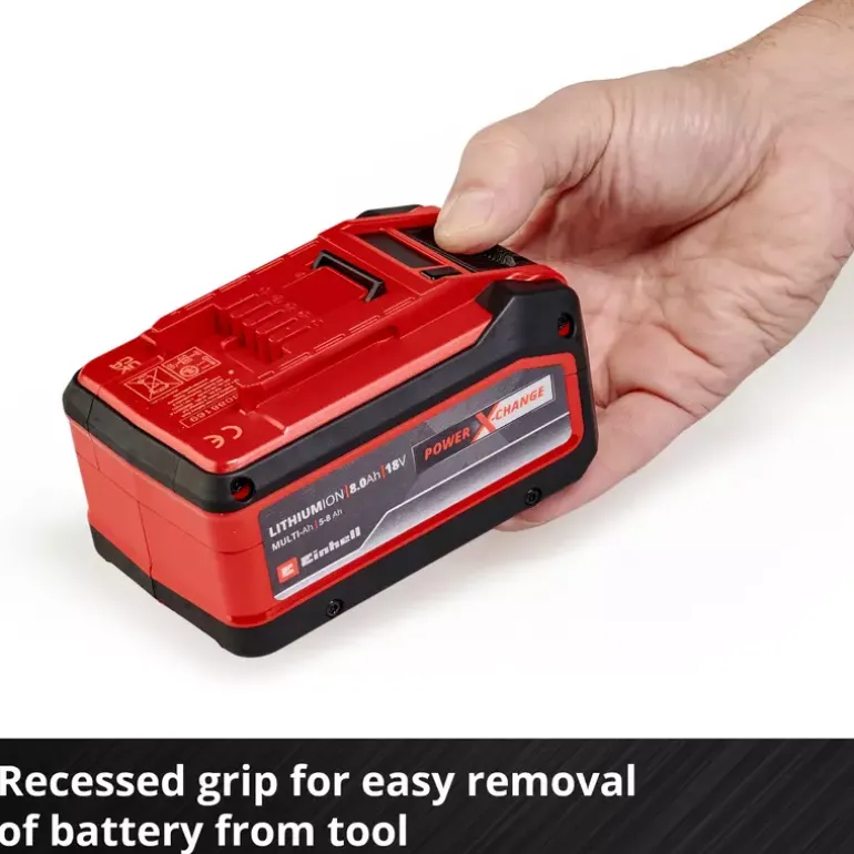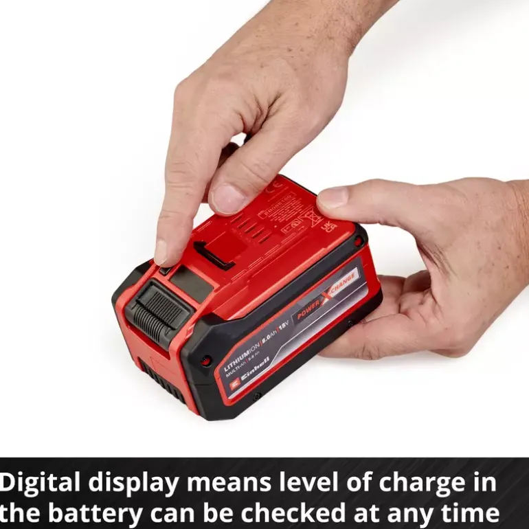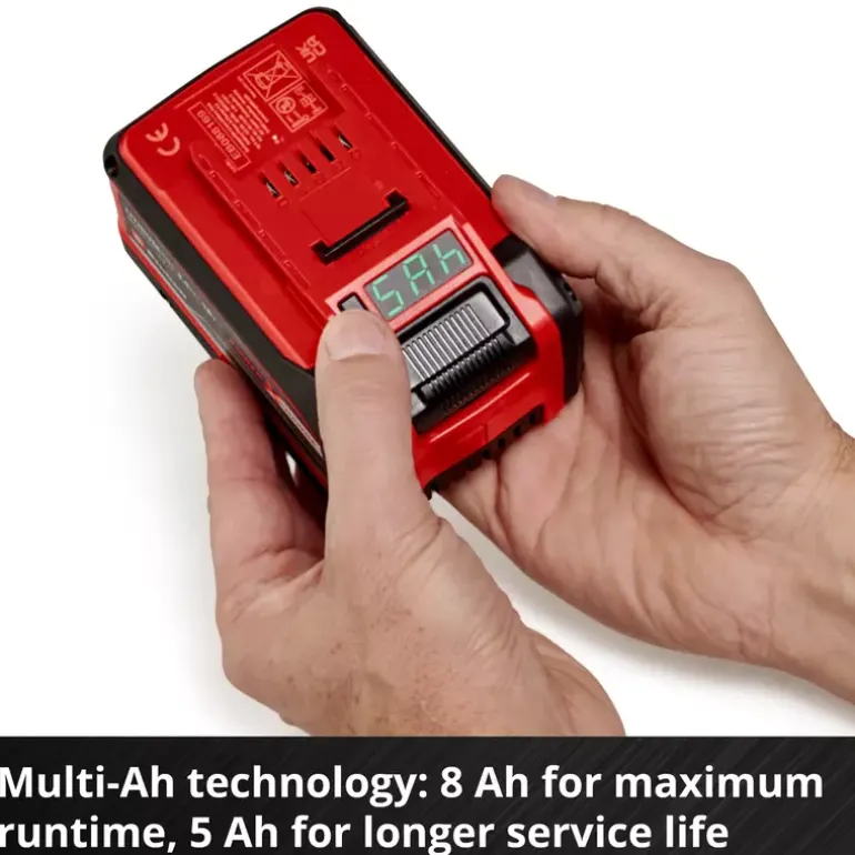 The Einhell 18V 5–8 Ah Multi-Ah PXC PLUS is part of Einhell’s multifunctional and infinitely combinable Power X-Change battery system. The universal Power X-Change batteries supply all cordless tools in the entire product family in the garden and workshop sector with power and endurance. The advantages for customers are clear: with one battery and one charger for all devices, you not only save considerable costs on the purchase, its universal nature protects the environment and also offers flexibility in the home and garden. There will be no mess and chaos with a wide variety of batteries and chargers for each individual device. Thanks to MULTI-Ah technology, it can be operated as an 8Ah battery for maximum runtime and as a 5Ah battery for a 3x longer total service life. The latest generation of lithium-ion cells provide 100% more power for maximum performance in all applications. The PLUS technology also means extra power for intensive work. In addition, the high-quality battery resists the memory effect and the self-discharge that usually occurs in batteries for constant, high power. The 18V 5–8 Ah Multi-Ah Power X-Change PLUS is a high-end battery in the Power X-Change family and is also suitable for TWIN PACK use in 36V applications. The process-driven ABS active battery management system continuously monitors the battery settings using the integrated microprocessor. This ensures maximum safety, optimal device performance, maximum runtime and maximum service life. The exact, current state of charge in % can be controlled on the digital display. The housing is resistant to dust, corrosion and mechanical influences thanks to its construction. The rubber coating gives the battery high impact protection and a good grip. Thanks to the recessed grip, it can be easily removed from all units.