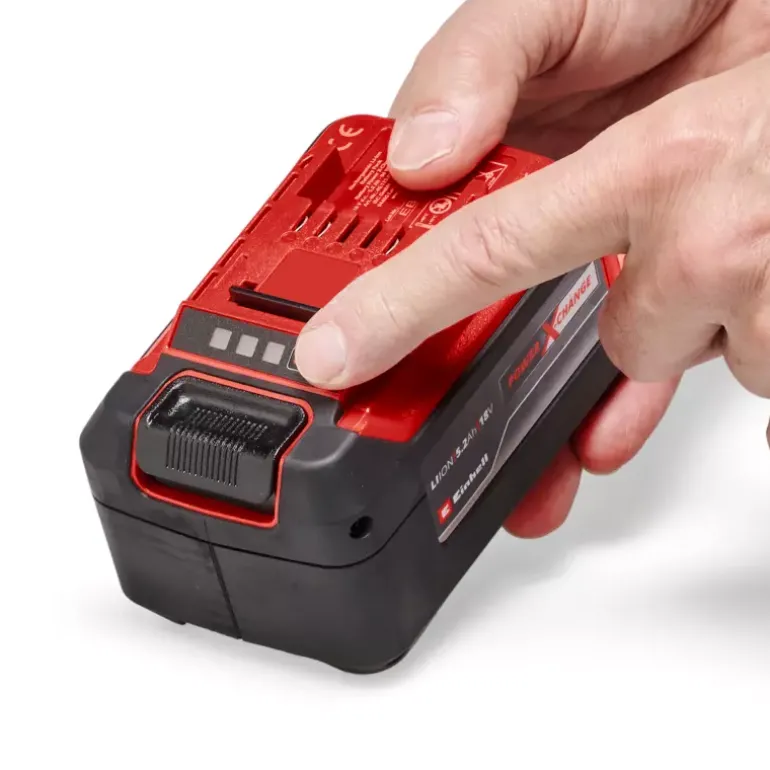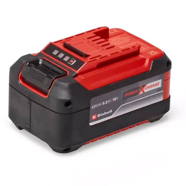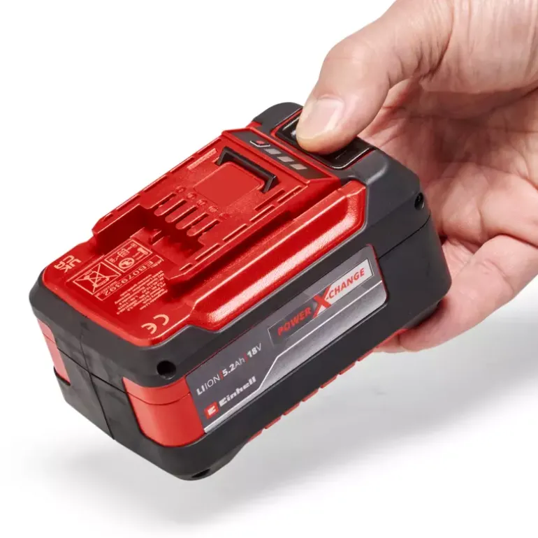 The Einhell PXC 18 V 5.2 Ah battery is part of the multifunctional Power X-Change platform, in which all batteries, chargers and system devices can be combined. The universally applicable PXC batteries supply every cordless tool in the entire product family with reliable power and endurance. This high-quality battery resists both the memory effect and typical self-discharge to ensure consistently strong performance. The 5.2 Ah battery is also suitable for Twin-Pack use in 36 V applications. The process-controlled, active ABS battery management system continuously monitors all battery parameters via its integrated microprocessor. This ensures a high level of safety, optimal device performance, long runtime and an extended service life. The current charge level can be checked at any time via the 3-stage LED indicator. The casing is designed to withstand dust, corrosion and mechanical stress, while the rubberised surface provides excellent shock protection and a secure grip. The integrated recessed grip also allows the battery to be removed from any compatible device with ease.