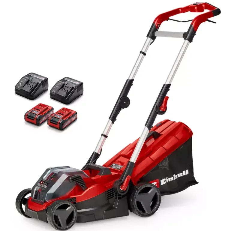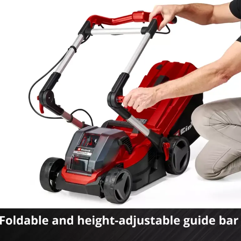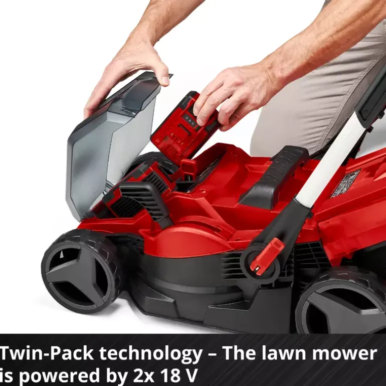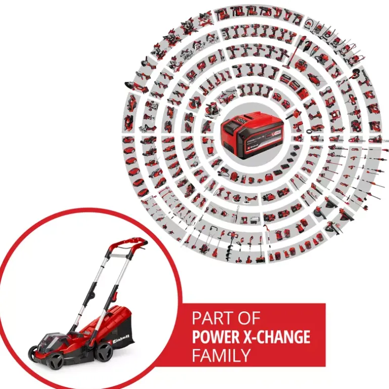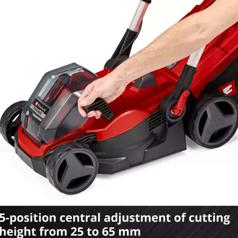 The Einhell cordless lawn mower RASARRO 36/34 (2×3.0 Ah) is a very high-quality, reliable and powerful device for cordless maintenance of small to medium-sized lawns. The 11.9 kg light and manoeuvrable mower has a cutting width of 34 cm. The cordless lawn mower is part of the Power X-Change family, where the batteries, chargers and system devices can all be flexibly combined. The lawn mower is powered by the 36 V twin pack technology, which combines the power of two powerful 18 V batteries for extended use without annoying power cables. The five-stage central cutting height adjustment allows easy, individual adjustment of the cutting height from 25 to 65 mm. The RASARRO 36/34 is equipped with a height-adjustable and foldable guide bar. This allows it to be perfectly adapted to any height and stowed away in a space-saving way. As a highwheeler, the RASARRO 36/34 has raised rear wheels that make it easier to work in difficult terrain. Its large wheels also protect the lawn. The large grass collection basket can hold up to 30 litres of cut material and is equipped with a fill level indicator, so that you can immediately see when emptying is required. The durable housing is made from high-quality, impact-resistant plastic. A practical carrying handle ensures easy transport. The cordless lawn mower RASARRO 36/34 (2×3.0 Ah) comes with two 3.0 Ah Plus Power X-Change batteries and two chargers. The mower is recommended for lawn areas up to 300 m².