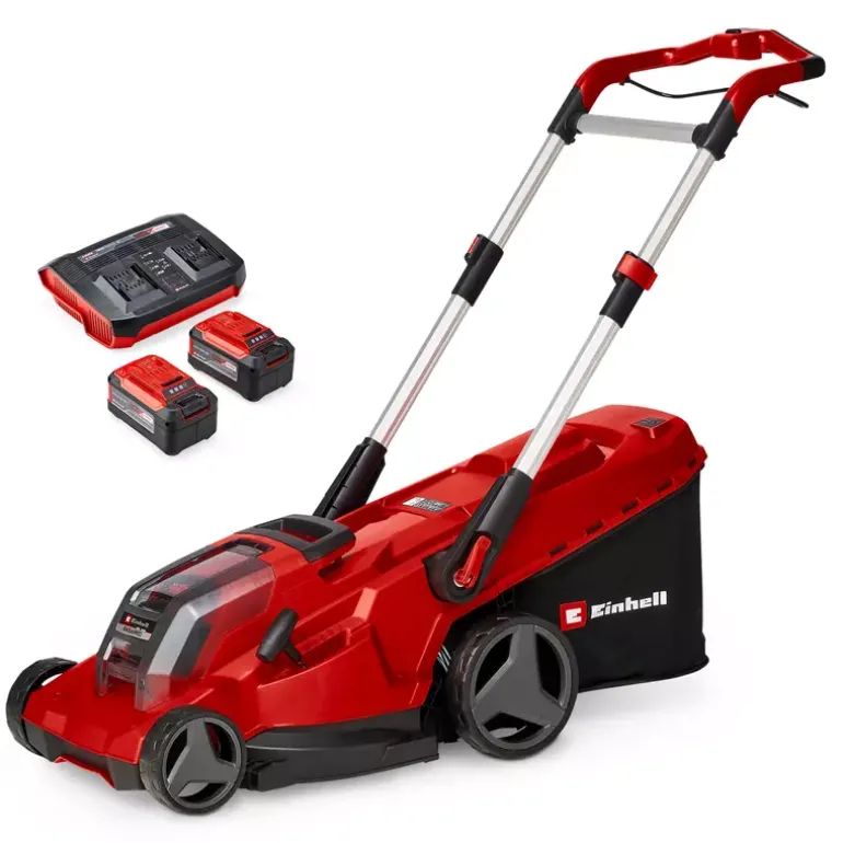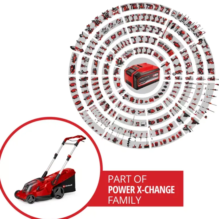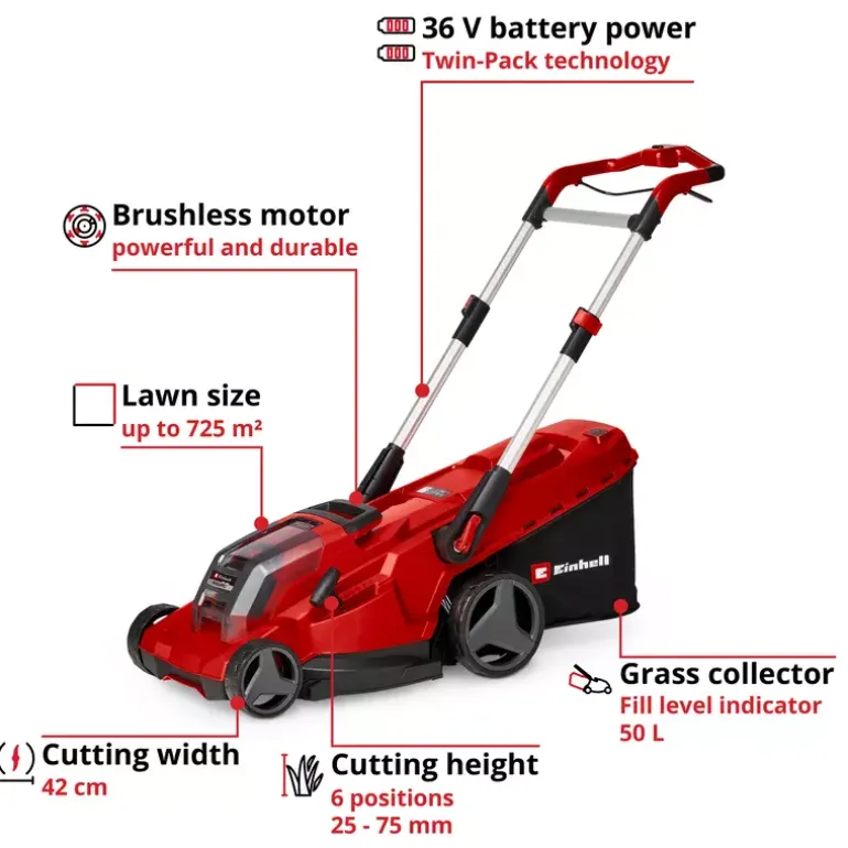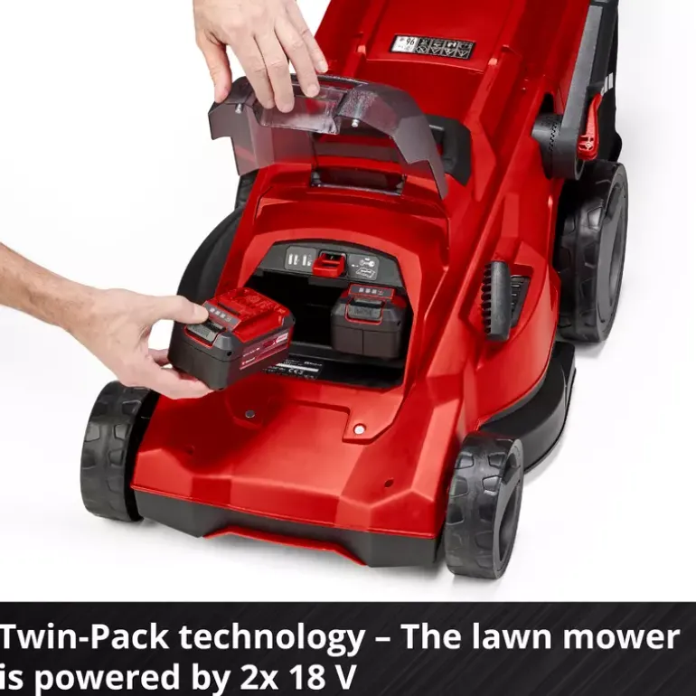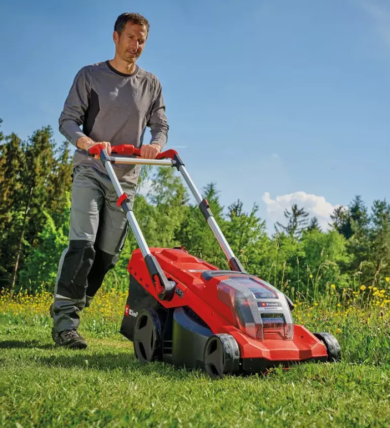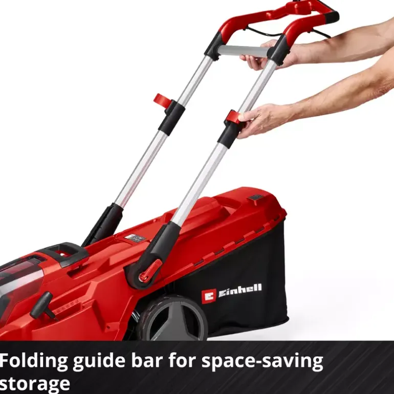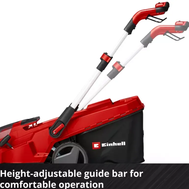The Einhell cordless lawn mower RASARRO 36/42 (2×5.2 Ah) is suitable for maintaining an even lawn in the home garden. The lightweight and compact mower weighs approx. 15 kg, features a cutting width of 42 cm and is recommended for lawn areas of up to 725 m². The cordless lawn mower is part of the Einhell Power X-Change family, in which all batteries, chargers and system devices can be flexibly combined. The lawn mower is powered by 36 V TWIN-PACK technology, combining the power of two 18 V batteries for cordless operation without a power cable. The six-stage central cutting height adjustment allows easy, individual adjustment of the cutting height from 25 to 75 mm. The large grass collection box holds up to 50 litres of clippings and is equipped with a practical fill level indicator. The housing is made of high-quality, impact-resistant plastic. An integrated grass comb supports an even cutting result and makes edge mowing easier. In addition, a mulch plug enables fine shredding of the clippings, which are then evenly distributed on the lawn. The RASARRO 36/42 is equipped with a height-adjustable, telescopic and foldable handlebar. This allows individual adjustment to the user’s height and space-saving storage. As a highwheeler, the cordless mower features raised rear wheels that make operation on uneven terrain easier. The large wheels can also help reduce contact with the lawn surface. A practical carrying handle supports easy transport. The RASARRO 36/42 cordless lawn mower (2×5.2 Ah) is supplied with two 5.2 Ah Power X-Change batteries and a twin charger for charging two batteries simultaneously.