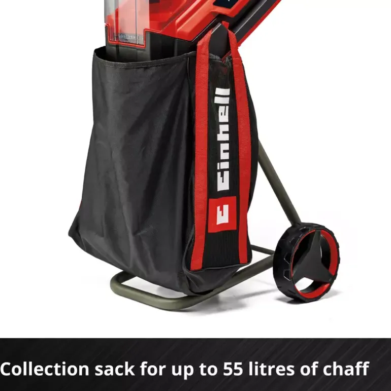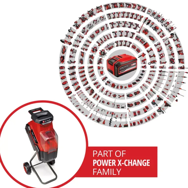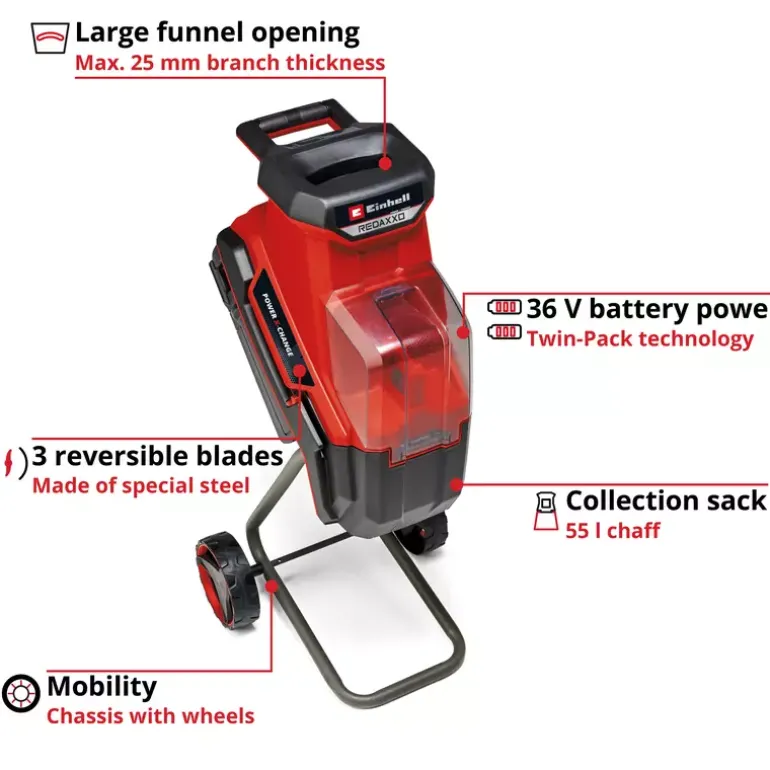 The Einhell cordless blade shredder REDAXXO 36/25 brings cordless freedom to any garden! No matter where garden waste such as hedge clippings, shrub residues, leaves or branches are generated – with the cordless shredder they can be shredded directly on site, without any power connection. The cordless blade shredder is part of the Einhell Power X-Change family and can be combined with all batteries and chargers of the system family. For maximum performance, the 36 V Twin-Pack technology combines the power of two 18 V batteries. For optimal performance, it is recommended to use 5.2 Ah or greater batteries. During use, the batteries are protected from dirt, rain and shock by the hinged battery cover. Whether dry, hard branches or garden waste such as foliage, shrub or hedge cut – thanks to the large funnel opening and the pusher, branches with a max. diameter of 25 mm as well as other garden waste can be easily and safely fed through. Depending on the material, the chaff is then suitable for space-saving disposal, composting or as a mulch. The included stopper is always at hand thanks to the integrated holder. Also included in the scope of delivery is a high-quality bag with a volume of 55 litres, which can be easily hooked into the hooks on the housing. The cordless shredder is particularly mobile thanks to its robust chassis with wheels and integrated transport handle. For easy cleaning and maintenance, the chopper is equipped with a hinged hopper with safety lock. This makes it easy to loosen blockages so that the three reversible knives made of special steel can be shredded vigorously again. Safety in use is ensured by the motor protection switch, which protects against overload. The cordless blade shredder REDAXXO 36/25 is supplied without a battery or charger. These are available separately.