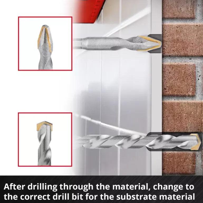 The 10-piece S-CASE from Einhell contains five masonry drill bits and five hard ceramic drill bits with an extremely hard, high-temperature brazed carbide plate. Thanks to the special grinding of the carbide plate, the porcelain stoneware drill bits impress with particularly sharp cutting edges, making them ideal for extremely hard tiles such as porcelain stoneware. The pronounced centre point enables precise drilling without slipping on the workpiece. The masonry drill bits are also equipped with a carbide plate, which enables fast and clean drilling in masonry. Made from robust, sandblasted tool steel, the double helix ensures efficient drill dust transport on the one hand and good ventilation and cooling of the drill hole on the other. The Einhell set is particularly impressive due to the careful combination of the different drill bits, as the tile drill bits are ideal for drilling through tiles, while the masonry drill bits are used to penetrate the wall behind them. This tool change enables an optimum result. The tile drill bit set is particularly suitable for working on marble, extremely hard porcelain stoneware, roof tiles, wall and floor tiles and granite. It is ideal for renovation work in the DIY sector, but also for professional use by slab and tile layers. When using the drill bits, it is recommended to use them without impact, with high contact pressure in first gear and a maximum speed of 400 revolutions per minute. Thanks to the E 6.3 shank, the masonry drill bit set is compatible with all standard drill chucks and bit holders in commercially available cordless screwdrivers and drills. The milled hexagonal shank prevents slipping in the drill chuck. The tool set is supplied in a practical storage box with a robust auto-lock clip closure, transparent lid and interchangeable inserts for customised assembly.