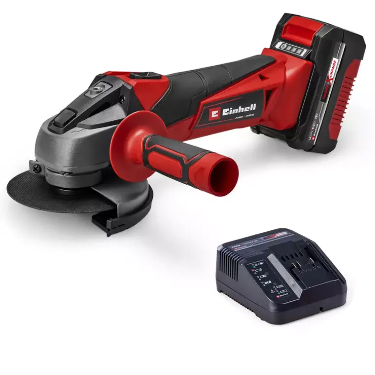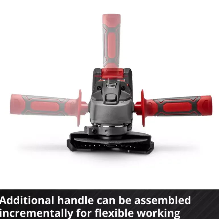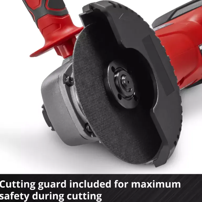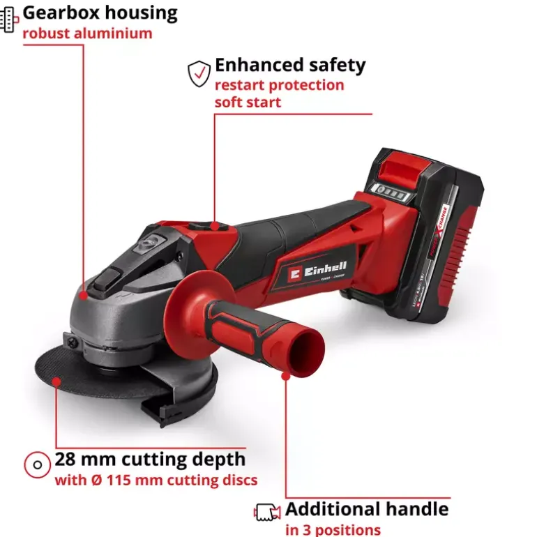 With its low weight, the Einhell cordless angle grinder TC-AG 18/115 Li (1×4.0Ah) is a light and therefore handy angle grinder with a cutting depth of maximum 28 mm and a disc diameter of 115 mm. Whether powerful cutting, grinding or polishing, with an idle speed of 8,500 revolutions per minute, the angle grinder is a useful helper in the home workshop and hobby cellar. The tool belongs to the Power X-Change family: The batteries of the powerful lithium-ion system series can be utilised in all devices of the series. Soft start and restart protection always ensure increased application safety, while overload protection in turn ensures the durability. The gearbox housing is made of robust and, at the same time, lightweight aluminium, the design is constructed as slim. Equipped with an ergonomic soft grip, the additional handle is flexible and can be assembled and fixed in 3 positions. For optimal results, a 2.5 Ah battery or higher is recommended. A 4.0 Ah Power X-Change battery and a charging device are included in scope of delivery. A cutting disc is not included in the scope of delivery, it is available separately.