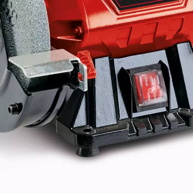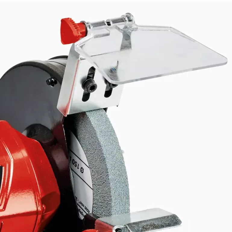 The Einhell TC-BG 150 double wheel grinder is a practical grinding/sanding machine for a wide range of applications. A double wheel grinder with two grinding/sanding wheels, each driven by a single motor, is an essential item of equipment in any workshed. A double wheel grinder can be used for sharpening scissors, knives and blades, cutting blades, drill bits and cutters, and even chisels. In addition, the double wheel grinder can also be used for derusting and deburring and for sanding/grinding and polishing a wide range of workpieces made of wood, plastic and metal. The double wheel grinder is specifically suitable for performing minor repairs and sharpening blades, but can also be used for strong repairs, adjustments to shape and new initial grinding/sanding as well. The robust compact metal construction ensures that the grinder has a long service life. Large adjustable work supports are a help for a wide range of applications, while the ball bearing mounted shaft with zero play makes it possible to achieve precise results. For safety there are spark guard windows which can be adjusted without any tools, plus guard hoods which are closed at the sides. Four rubber feet absorb vibrations and ensure a secure and steady standing position in operation. The product is supplied complete with a coarse and fine grinding/sanding wheel (K36/K60).