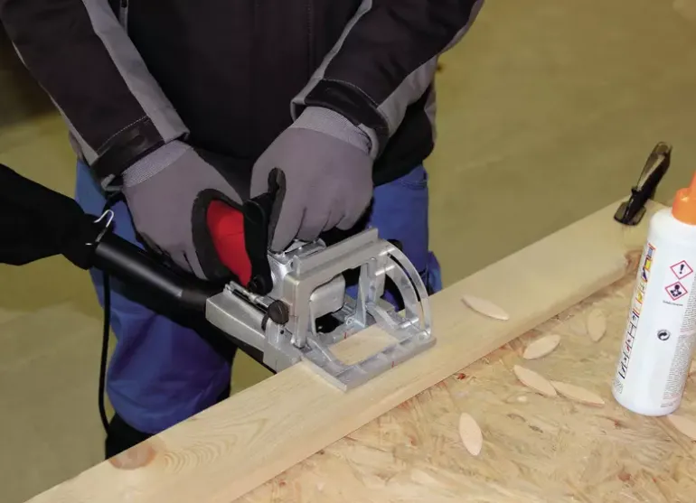 Clean joints are made possibly by the TC-BJ 900 biscuit jointer. Using this handy, powerful too, ambitious DIY enthusiasts can produce perfect butt joints and cabinet joints for numerous applications. Complicated structures are possible thanks to the infinitely variable angle and height setting facility. The routing depth can be set to three different levels easily by using the quick-adjust facility. A large base plate made of solid aluminium lends the TC-BJ 900 high stability for perfect, exact routing. The spindle lock enables fast cutter change. Among the accessories are a face spanner for changing the cutter and a dust bag for clean operation.