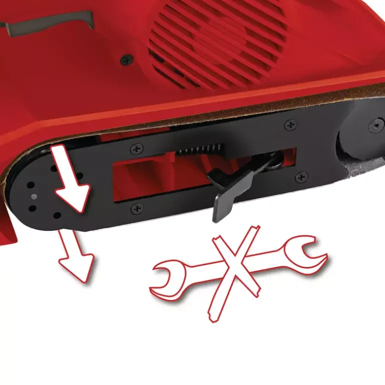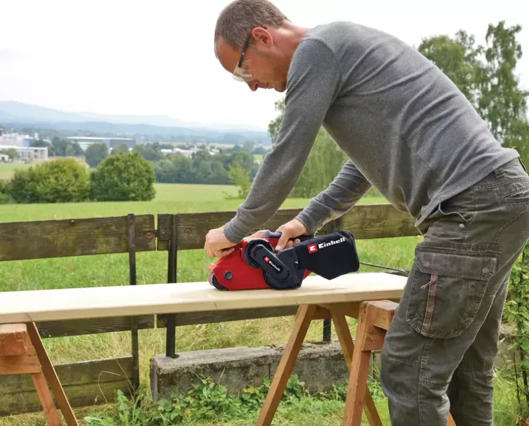 The Einhell belt sander TC-BS 8038 is an 800 W sander with a high rate of material removal. The simple, fast belt change facility takes the fuss out of using the tool. To enable an immediate start on a project, a grinding/sanding belt is included in the scope of delivery. The precision adjustment facility ensures precision belt positioning and optimum grinding/sanding results. An additional handle ensures comfortable handling and enables precise guidance of the grinder/sander over the wood. The additional ceramic guard offers protection in case the belt position is not set correctly. The integrated dust extractor and dust bag ensures a clean workplace despite the grinding/sanding job.