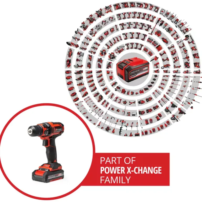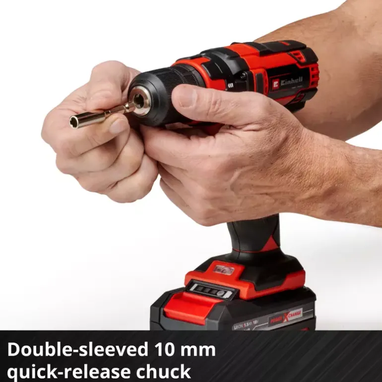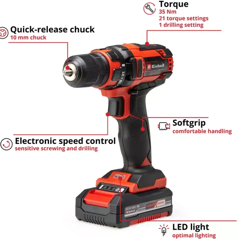 The Einhell TC-CD 18/35 Li (1×1.5 Ah) cordless drill/screwdriver is a popular assistant for all jobs around the home, workshop or garage and is a member of the innovative Power X-Change family. PXC rechargeable batteries can be used in every device from the garden and tools ranges of the innovative lithium-ion system series. For powerful drilling and screwdriving with flexibility and without the need for a power socket, the lithium-ion technology with zero self-discharge means that the cordless drill/screwdriver is ready for action at all times. With torque of 35 Nm and 22 torque settings, the electronic speed control ensures that the tool can be adjusted to the particular material and application. The drill chuck (10 mm) enables the matching accessories to be fitted with just a twist of the wrist. For optimum operation in dark or hard-to-reach areas as well there is LED lighting, which provides perfect visibility of the work area at all times. Comfortable operation is ensured by the ergonomic design and the softgrip, which are designed with exceptionally easy handling and a firm and secure grip in mind. Complete with one 1.5 Ah PXC rechargeable battery and the one-hour charger. The product is supplied in a practical storage box.