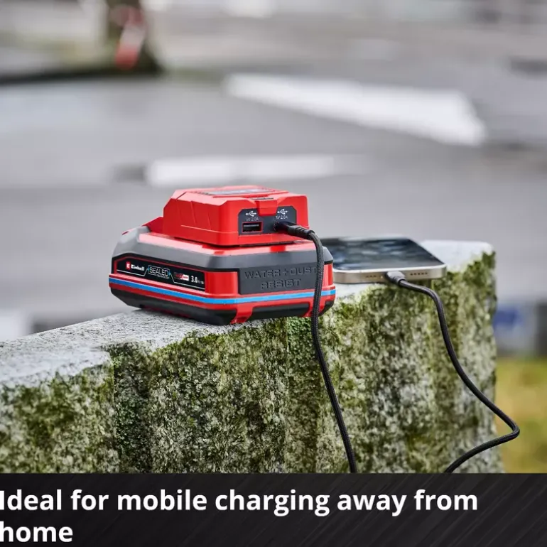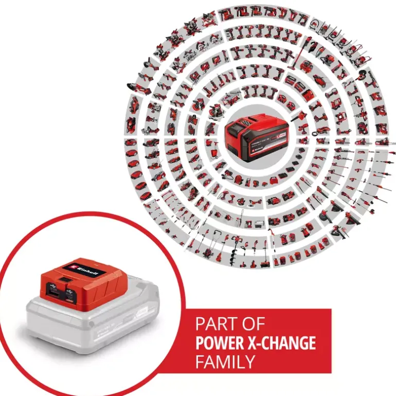 With the Einhell TC-CP 18 Li USB A/C-Solo USB battery adapter and a Power X-Change battery (available separately), you will always have an external power source to hand for mobile devices such as smartphones, tablets and e-book readers. Its two USB ports can be used to charge two devices simultaneously with 2.0 amps each, or to power them with 5 volts. The adapter is equipped with a USB-A port and a USB-C port. An LED indicator on the case of the adapter indicates the operating state at all times. As soon as the battery adapter is switched on via the button and the LED lights up, it can be used to charge or power low-consumption devices. The adapter comes without a battery or charger.