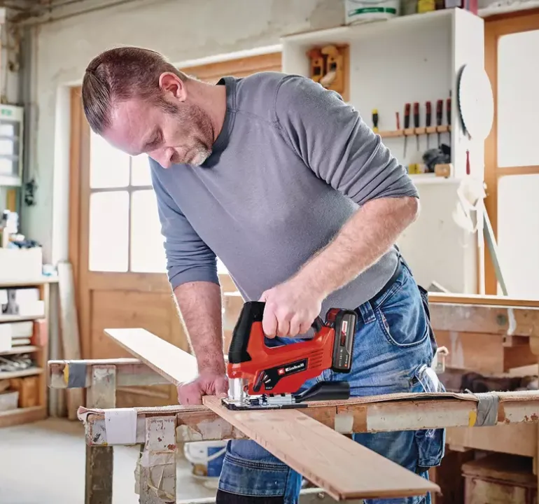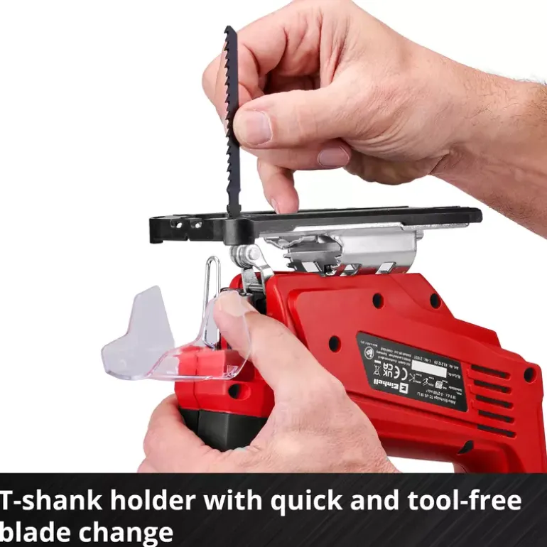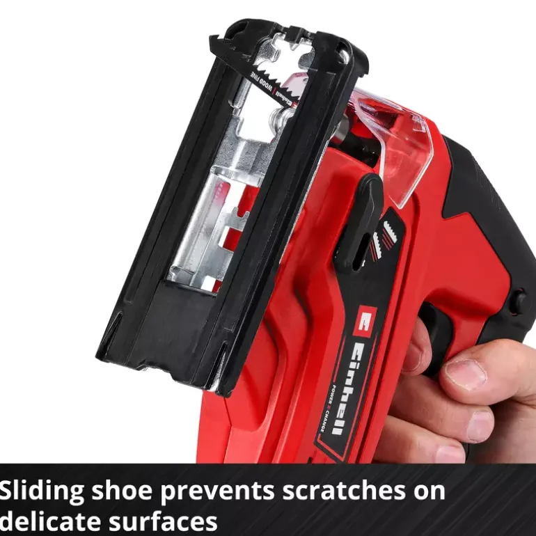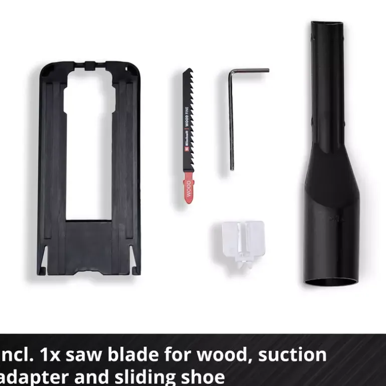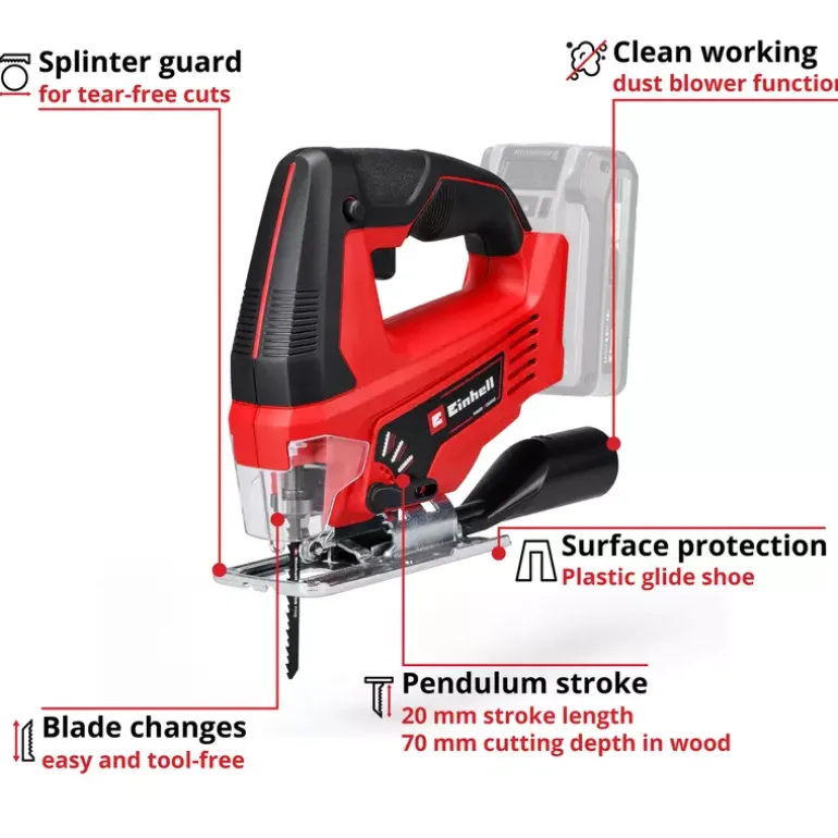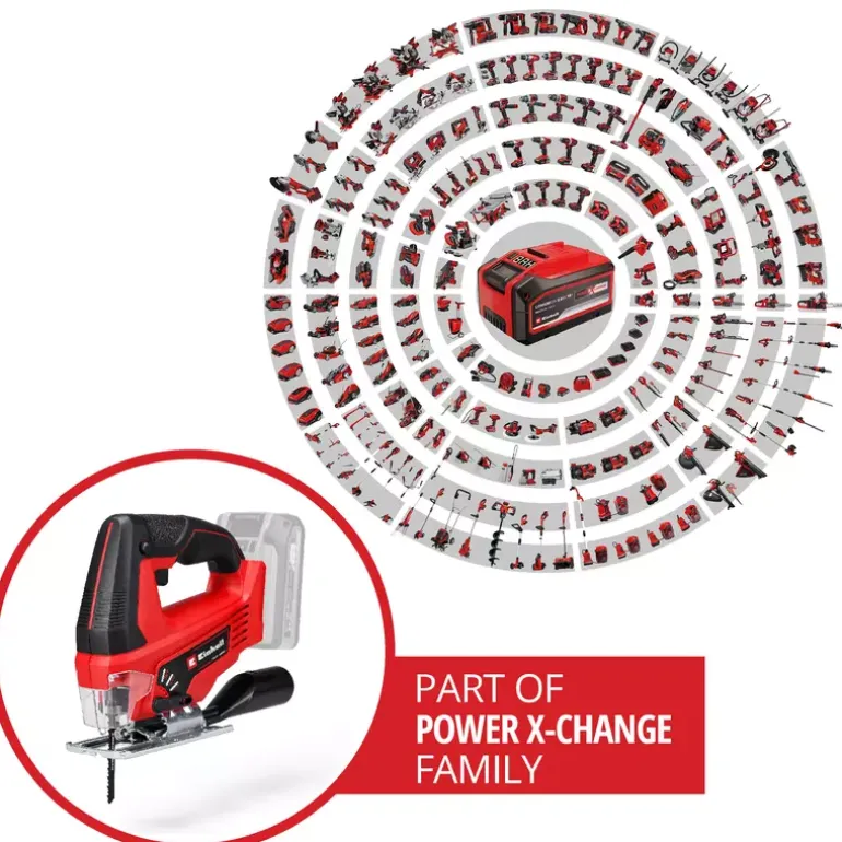 The Einhell TC-JS 18 Li cordless jigsaw is always ready to hand when it comes to the perfect cut in a wide range of materials. As a member of the Power X-Change family it offers great flexibility for jobs in the home, workshed and garage. Cordless freedom with concentrated rechargeable battery power: The rechargeable batteries from the Einhell system family can be used in all PXC devices. Thanks to really smooth operation, the cordless jigsaw delivers exact cuts. For fast cuts it has a selectable pendulum action. The universal blade holder without tools saves unnecessary hand movements, enabling the blade to be changed quickly and without the need for any tools. For optimum visibility while working there is a dust blow-off function. The integrated plastic sliding element protects particularly sensitive workpieces. The product is supplied complete with a quality saw blade for wood. This product comes without a battery or charger. These are available separately, for example as a practical Einhell starter set.