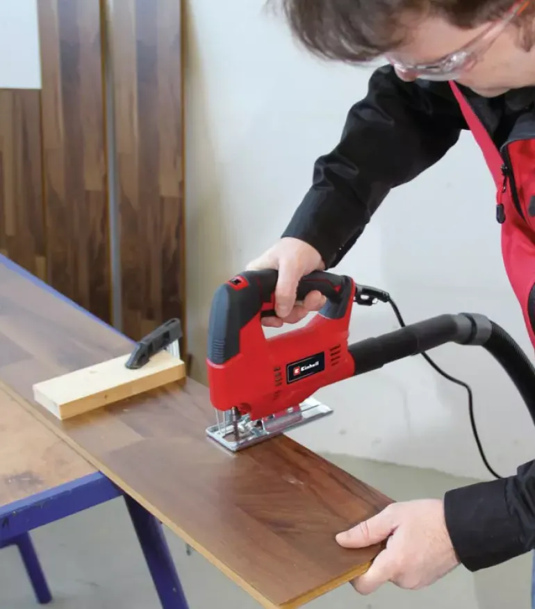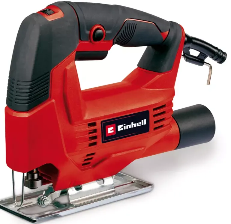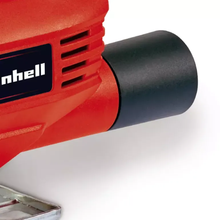 The Einhell TC-JS 60/1 jigsaw makes a clean, quick and professional job of cutting and sawing work. For wood, plastic or metal materials: The jigsaw helps you perform work on different materials easily and exactly. Thanks to its 400 W rating the jigsaw is powerfully equipped for jobs in the home, workshop and garage. It offers a cutting depth up to 60 millimeters for wood, 10 millimeters for plastic and 6 millimeters for metal. The stroke height is 18 millimeters. At the same time the Einhell TC-JS 60/1 jigsaw is small, light and easy to handle to make light work of sawing. Being well-balanced it has low vibrations in operation. In addition the Softgrip makes it comfortable to use and prevents fatigue. Electronic speed control ensures the ideal speed for the work material. Also, the soleplate of the Einhell TC-JS 60/1 jigsaw can be swiveled by up to 45 degrees to allow miter cuts. For a clean work area there is an adapter for a dust extractor.