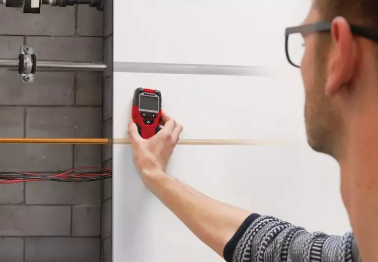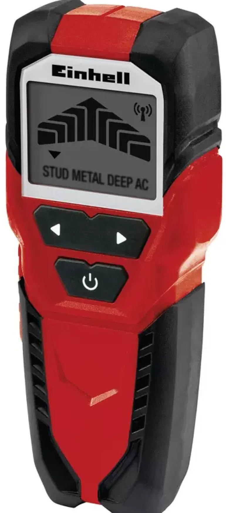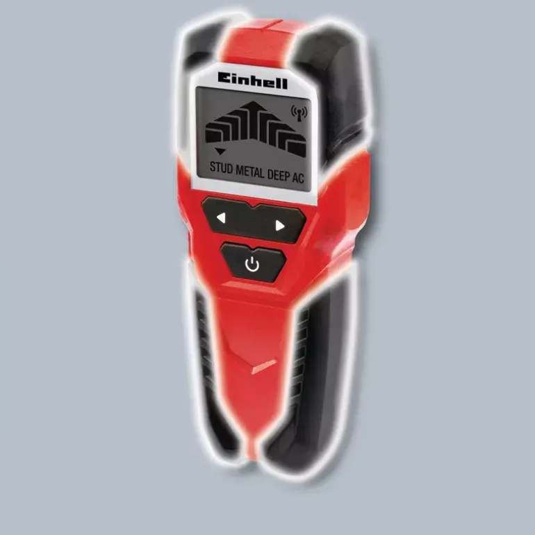 The Einhell digital detector TC-MD 50 is an indispensable helper for DIY enthusiasts: in the home, at the building site or for renovation work – the digital detector is unbeatable for reliable localization in walls. The detector reliably locates metal, wood and electric leads in dry walling: It detects ferrous metals such as steel, for example, and live wires to a depth of 50 millimeters, and non-ferrous metals such as copper, for example, to a detection depth of 38 millimeters. Wood can also be detected to a depth of 19 millimeters. Operation is easy and intuitive thanks to an acoustic warning signal. Protector pads are also fitted on the back to protect the wall. The soft grip makes it comfortable to operate with just one hand. If the Einhell digital detector TC-MD 50 is set down to one side, it switches off automatically after one minute without being used.