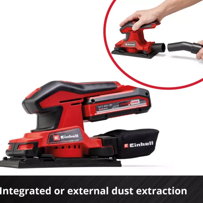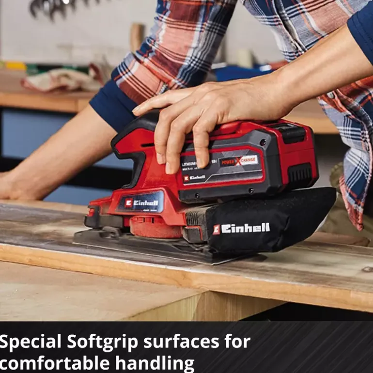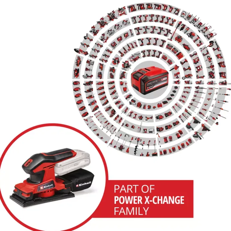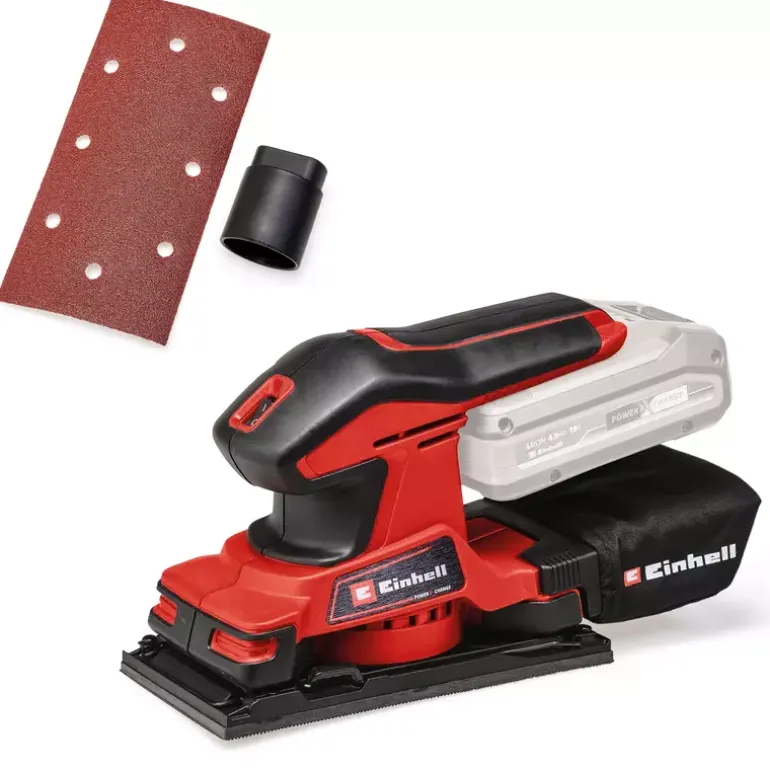 The Einhell TC-OS 18/187 Li Solo cordless orbital sander is a light and handy orbital sander from the Power X-Change family, with all the advantages of the flexible, completely interchangeable system series. The cordless orbital sander is ideally suited for grinding/sanding flat surfaces, large workpieces, lining materials or panels. Thanks to the micro hoop-and-loop fastening and clamping device, changing the abrasive paper is quick and easy and sheets of abrasive paper without hoop-and-loop fastening can also be used. Large grip surfaces with soft grips make it comfortable to work with. A dust bag collects dust from sanding. In addition, it is also possible to connect a vacuum cleaner for keeping the work area really clean. One sheet of abrasive paper is included in delivery so that you can start your project right away. Supplied without a rechargeable battery or charger (available separately).