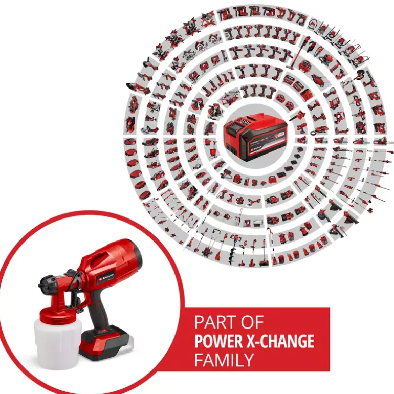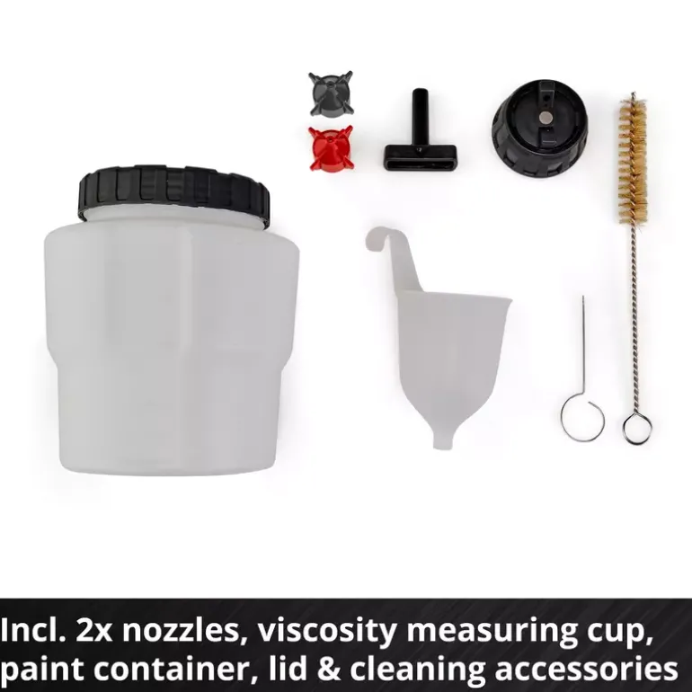The Einhell cordless paint spray system TC-SY 18/60 Li-Solo is suitable for spraying paints and glazes, detergents and impregnating agents as well as oils. The handheld system is suitable for small and medium-sized work surfaces, and the softgrip allows the spray gun to be handled safely and comfortably. As a powerful and flexible member of the Power X-Change family, all batteries can be combined with the high-quality lithium-ion cells and the spray gun. The battery and charger from the Power X-Change series are not included and are sold separately. The motor delivers up to 650 ml per minute through the adjustable air cap for vertical, horizontal and omnidirectional jets; the spray head is removable for cleaning all paint-bearing elements. The ink quantity regulation serves for the ideal adaptation of the ink application. For space-saving storage, a suspension device is attached to the housing. Delivery includes 2 nozzles for different varnish and glaze viscosities and 100 ml containers for viscosity testing, cleaning brush for cleaning the riser and cleaning needle for cleaning the spray nozzle, plus 800 ml paint container with measuring scale and the matching lid.