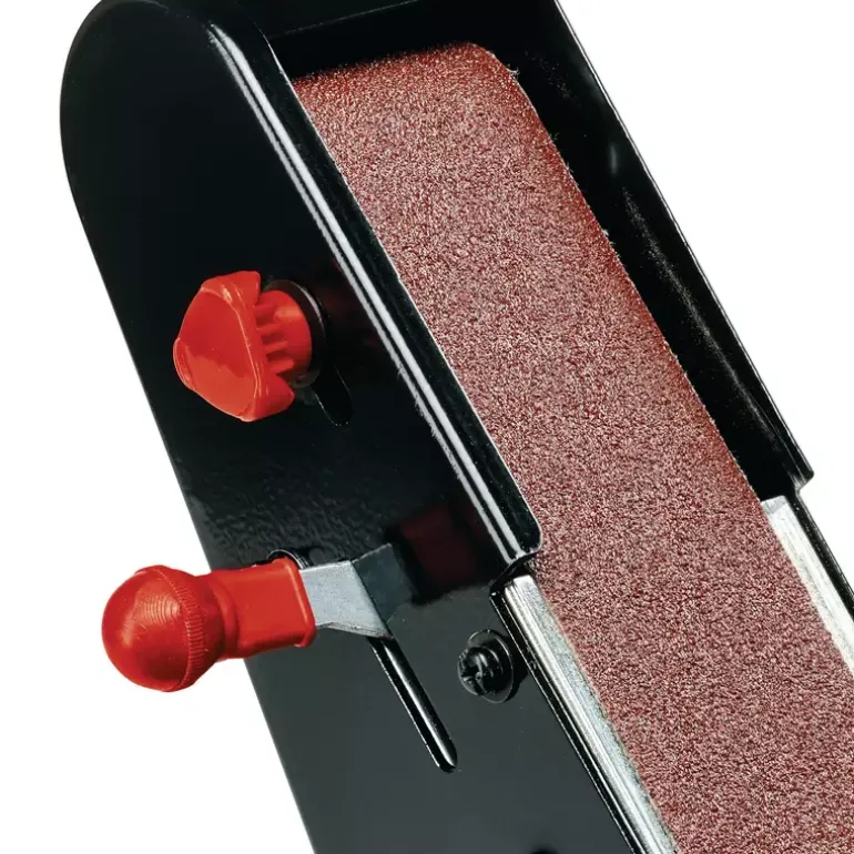 The Einhell TC-US 350 upright belt grinder/sander has a power rating of 350 W and grinding/sanding belt and grinding/sanding wheel functions. This combination grinder/sander offers a really impressively high removal capacity, making it ideal for major jobs on wood too. Thanks to the different grinding/sanding settings and grains, the upright belt grinder/sander can be used according to individual requirements. The guard hood which is closed at the side provides safety during operation, as does the spark guard window which can be adjusted without any tools. The sturdy and distortion-free design in combination with the large, adjustable work supports is ideal for a wide range of applications – including working on large and wide pieces of wood. Four rubber feet absorb vibrations to ensure a firm and secure standing position. The product is supplied complete with a coarse grinding/sanding wheel and a grinding/sanding belt.