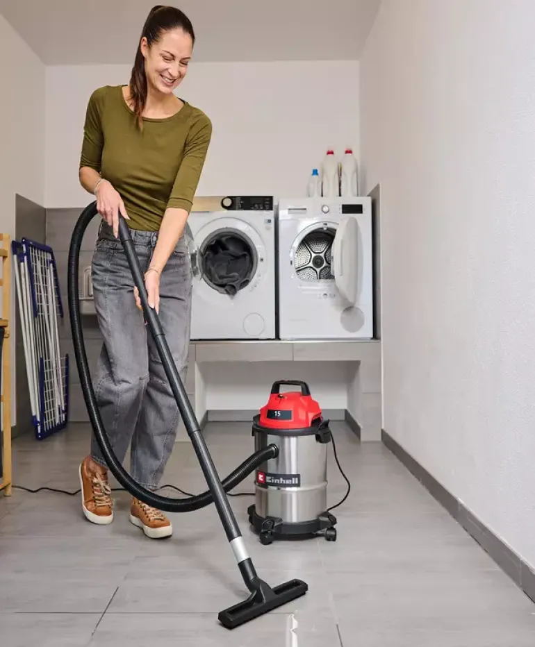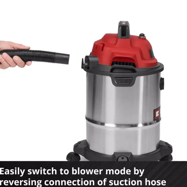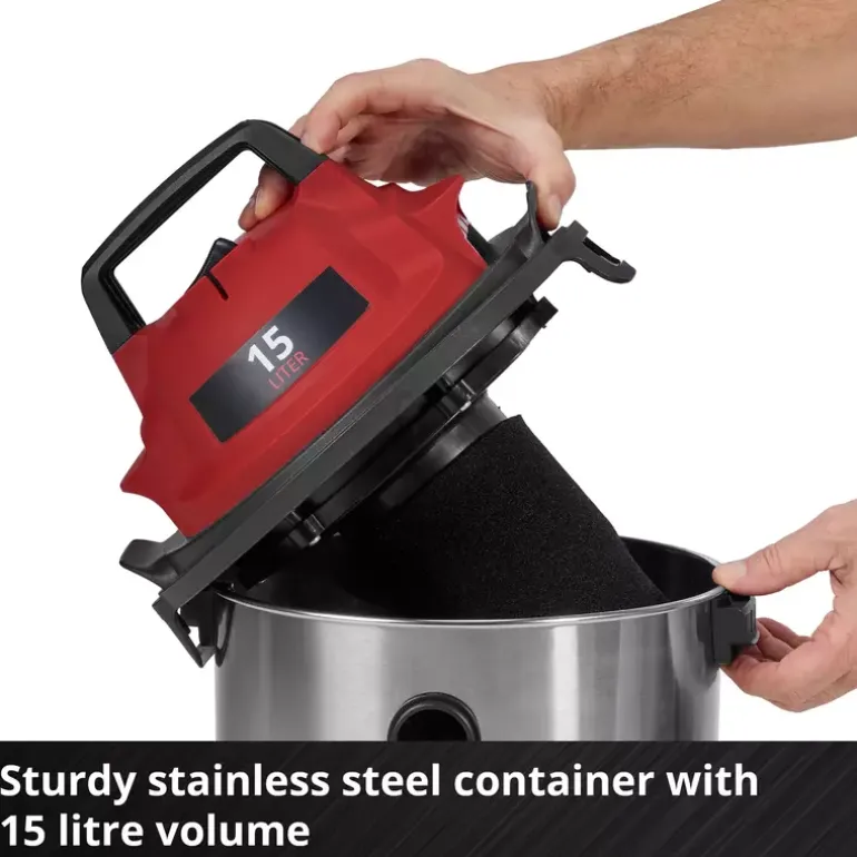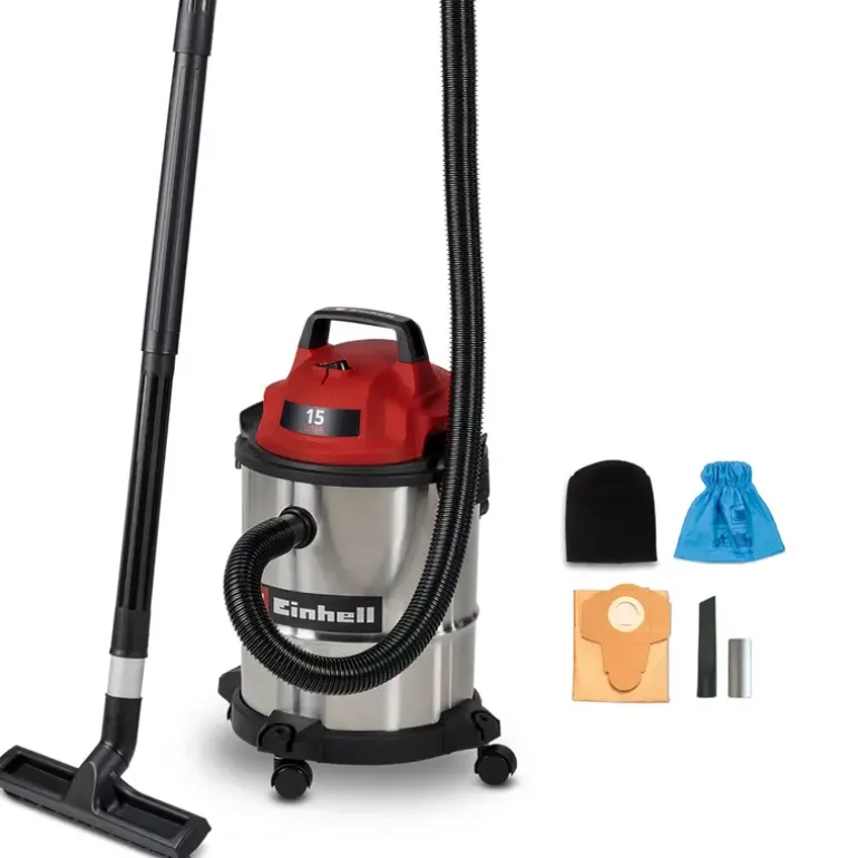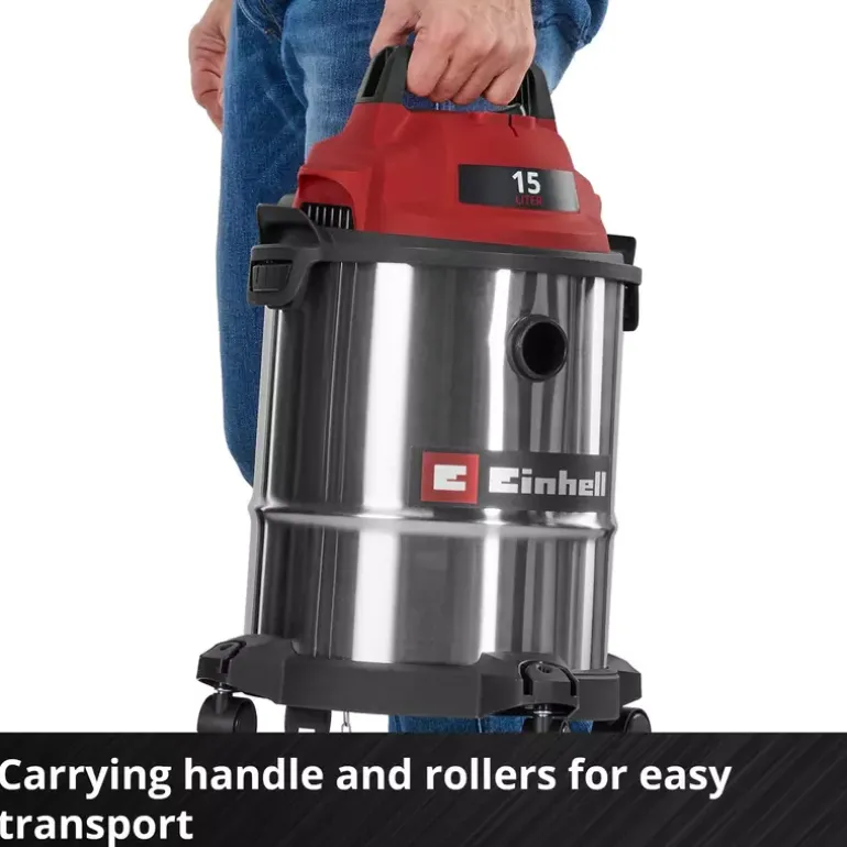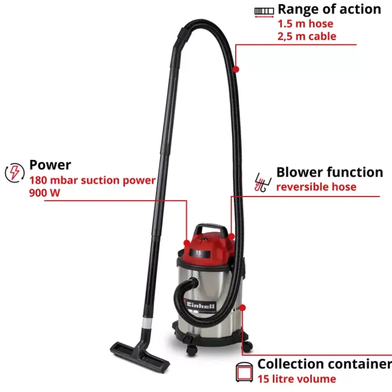 The Einhell wet/dry vacuum cleaner TC-VC 1540 S is a handy helper for any cleaning work around the workshop and garage. With 900 W of power and 180 mbar suction power, it reliably removes dust, dirt and even liquids from many surfaces. Even hard-to-reach areas can be easily cleaned by using the blow connection. The wet/dry vacuum cleaner is equipped with a stainless steel container with a 15 litre volume. A 1.5 m long plastic suction hose (Ø 36 mm) and the 3-piece plastic suction pipe provide for a large range of action with high air flow throughput for cleaning. You can use the 2.5 m long power cable to extend this range of action up to 4 m. You can wind the power cable directly onto the vacuum cleaner housing for storage. With its four sturdy swivel castors and integrated carrying handle, you can use this wet/dry vacuum cleaner on the move. The vacuum cleaner is supplied with a crevice nozzle for cleaning narrow passages and a large combi nozzle for carpets and hard floors. There is also a foam filter for wet cleaning plus a dirt collection bag and filter bag each for dry suction included.