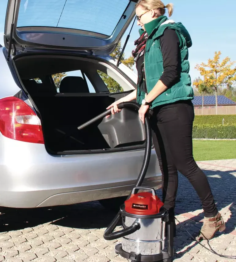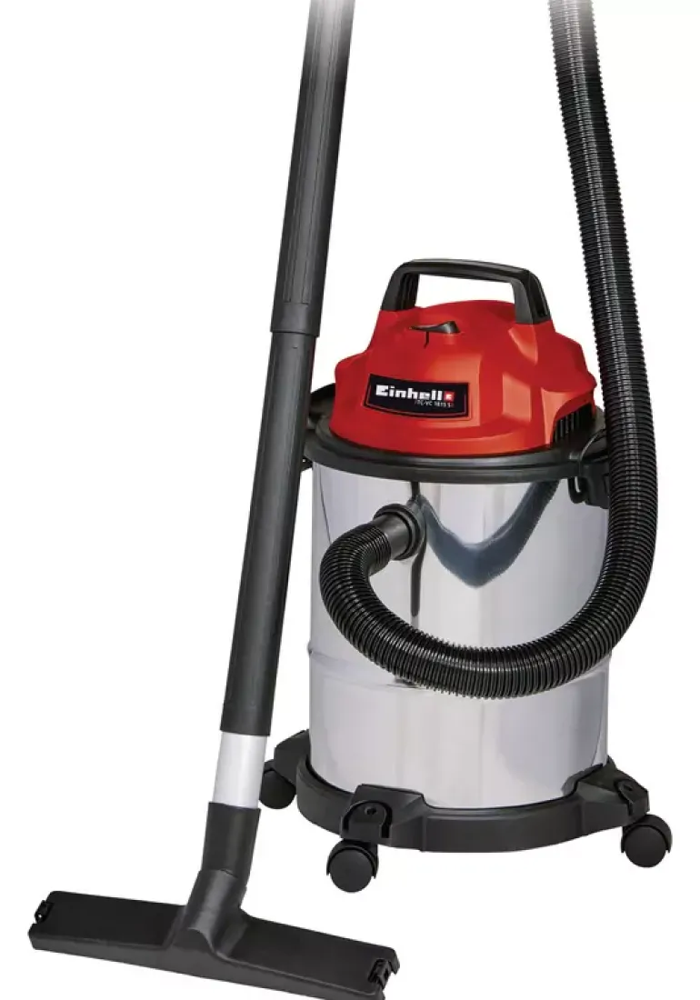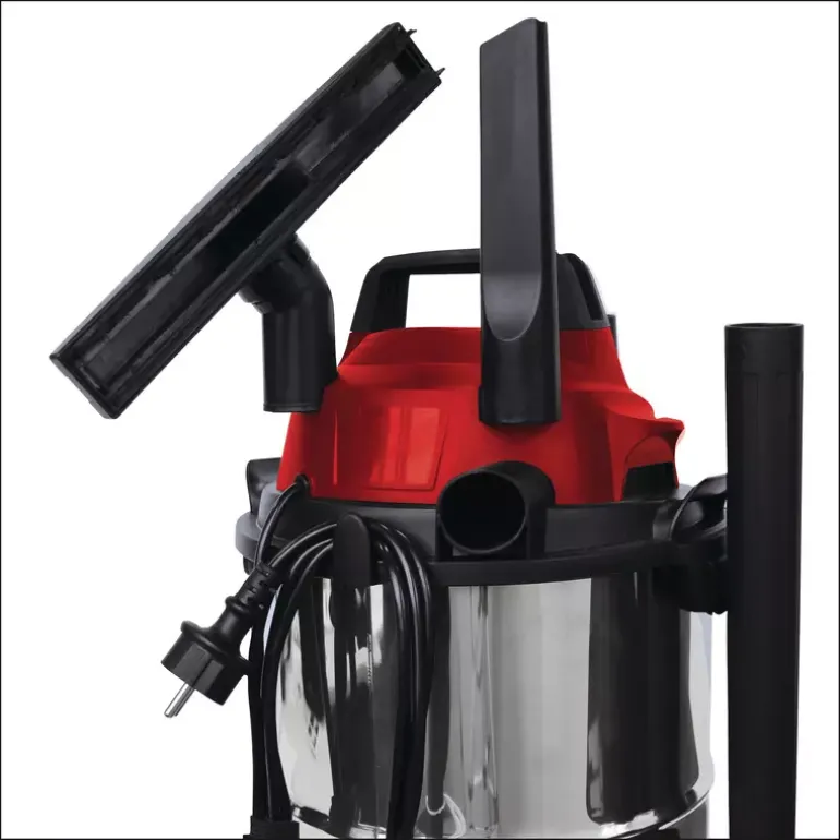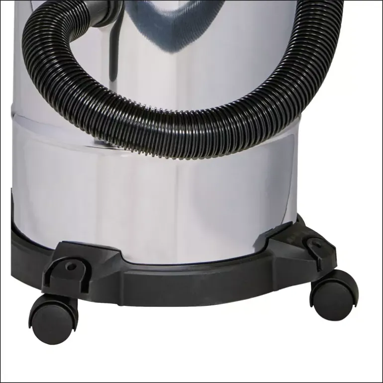 The wet/dry vacuum cleaner TC-VC 1815 S is a flexible and high suction all-purpose vacuum cleaner for simple wet- or dry cleaning which should be available in any household. The 15 litre stainless steel container is easy to clean, and collects rough, fine, wet or dry dirt, up to fluids even, without residues. Due to its strong 1,250 Watt motor, it is not only possible to reach a good suction performance, but there is also always sufficient pressure for the additional blowing of points which are difficult to access because of its practical blowing function. The robust dirt bag retains even fine dust in the system reliably, and so vacuum-cleaning becomes a clean affair. During wet cleaning, an additional foam filter protects the motor against soiling. The TC-VC 1815 S is equipped with a 36 mm hose system with small connection, consisting of a suction hose, 3 extension pipes an an adapter unit. The delivered big suction nozzle with combined insert can be equally used for carpets and smooth flooring, and additionally small corners and areas can be cleaned thoroughly with its crevice nozzle. All parts can be stored quickly and orderly directly on the device itself due to its practical equipment holder, the coiled electro cable can be fixed safely at the cable holder after work. The stable handle and four smooth-running castors provide an optimum of mobility.