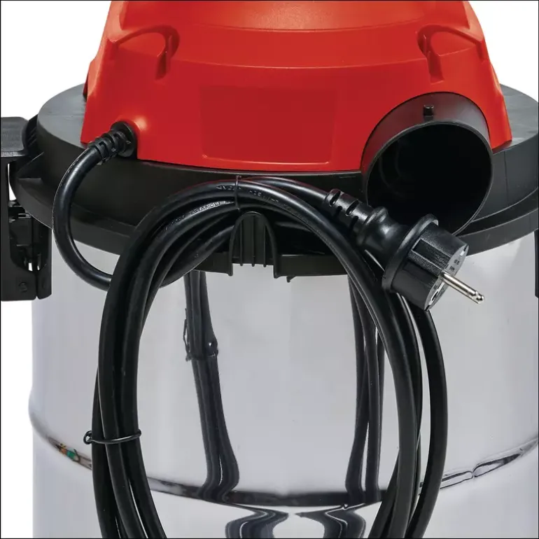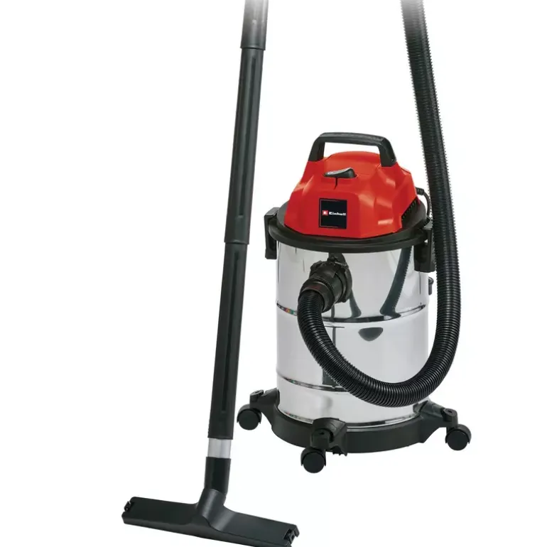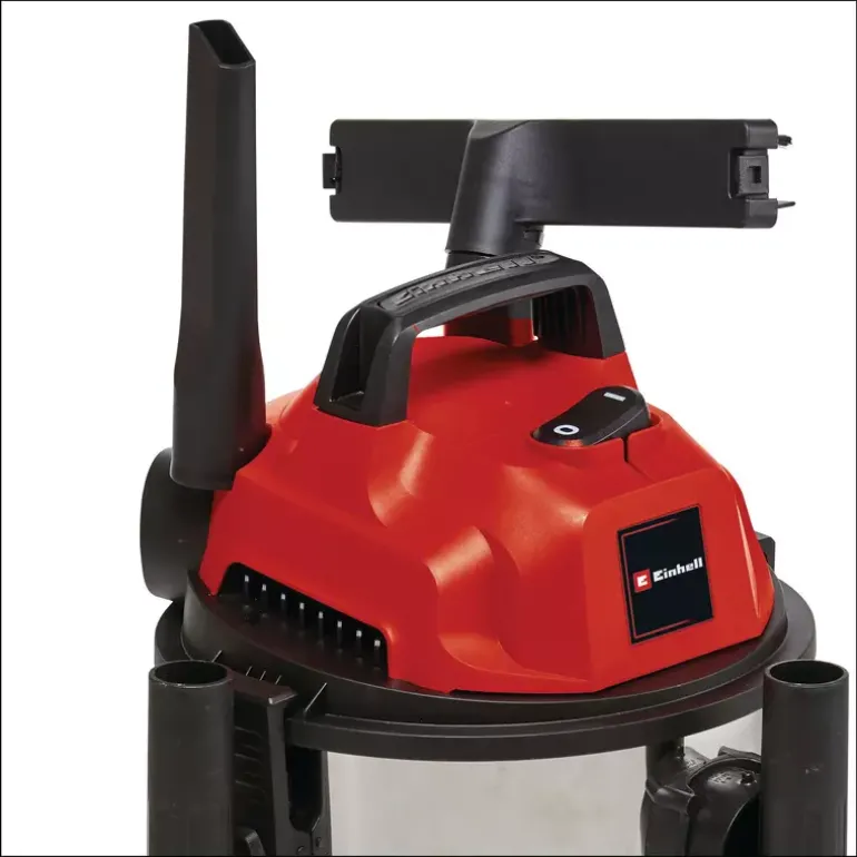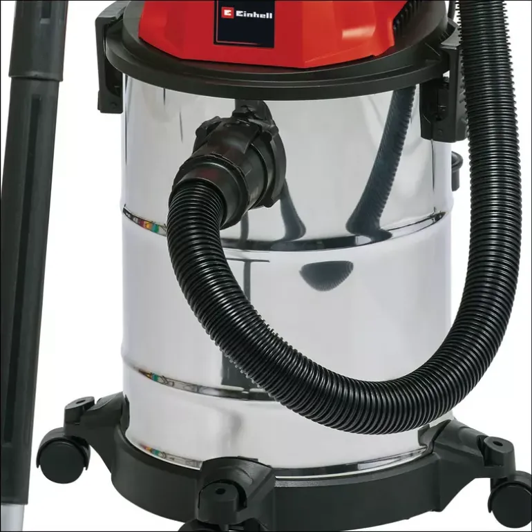 The Einhell TC-VC 1820 S wet & dry vac is a powerful helper with a 1,250 W rating for in-depth and thorough cleaning jobs. A wet and dry vacuum cleaner provides good service for the careful cleaning of surfaces that are not sensitive to water. For household work, for carpets or fixed textiles, tiles or all types of glazed tiles with open pores, normal surface cleaning alone is often not enough. A wet & dry vac can also be used for cleaning the insides of all kinds of vehicles, right to the tips of the textile material, be it seats and roof linings or mats and interior trim. The wet & dry vac from Einhell is equipped with a rust-proof and sturdy stainless steel tank with a capacity of 20 liters. The hose system with a diameter of 36 mm maintains high air and dirt flow. The blow connection is for blow-cleaning hard-to-reach areas such as in awkward corners or behind solid cupboards. For easy transport and flexibility in use there are castors. For tidiness during use there is a practical accessories holder and a cable holder on the housing. The product is supplied complete with a 1.50 m plastic suction hose with three-piece extension tube, a floor nozzle for carpets and smooth flooring along with a crevice nozzle, plus a foam filter, a blue filter bag and a paper dirt bag, so that nothing stands in the way of getting started right away.