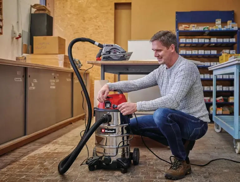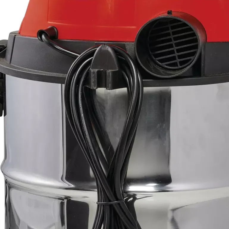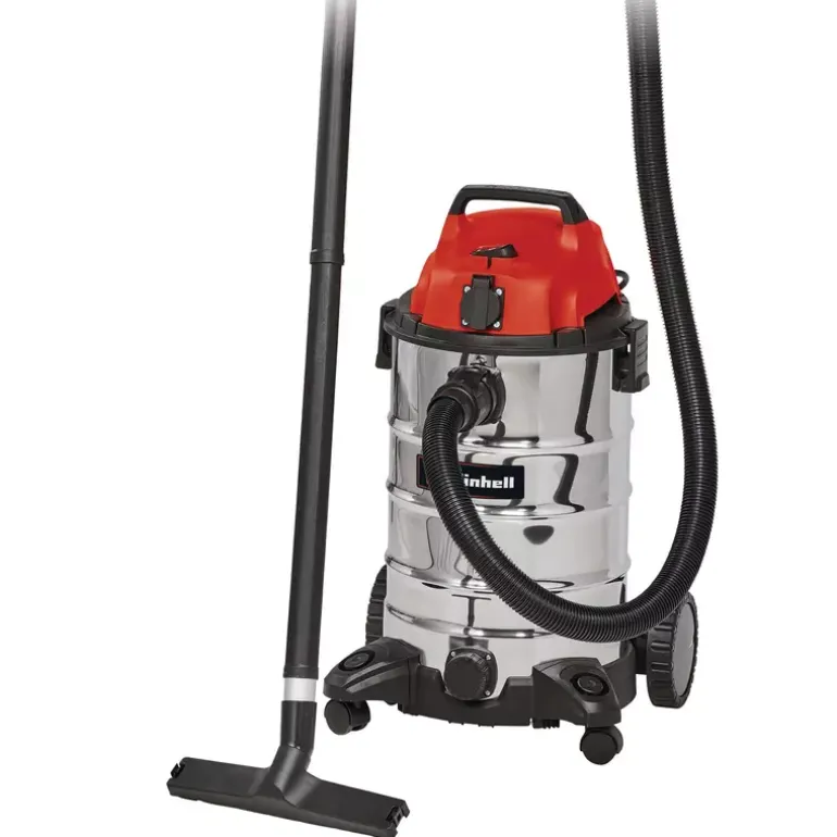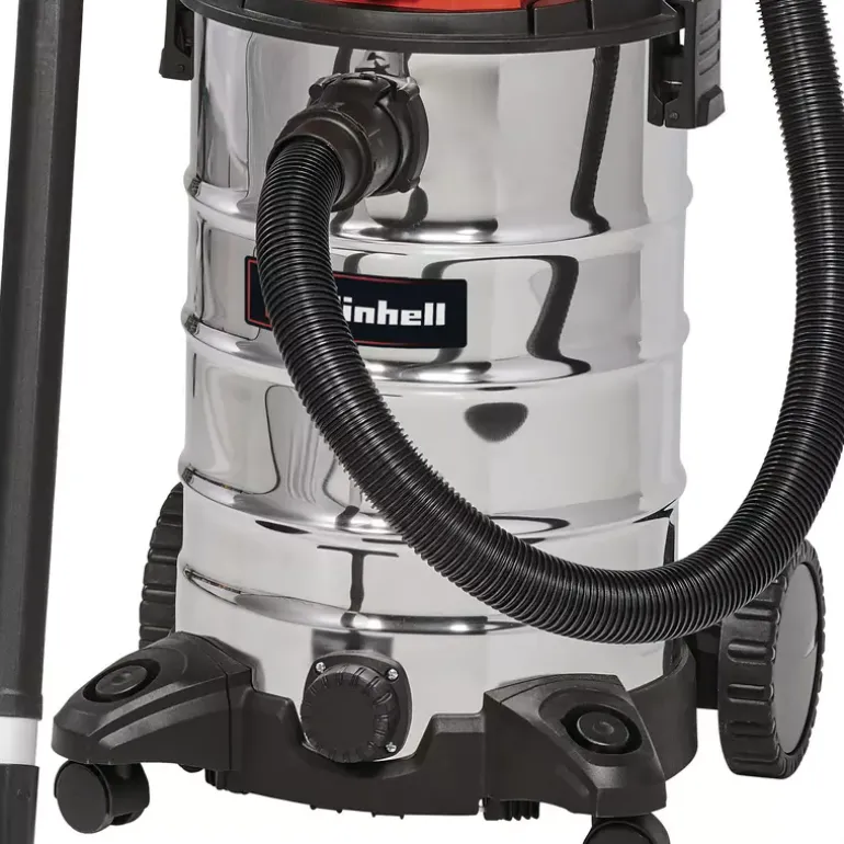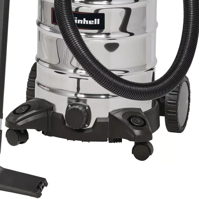 The Einhell Wet and Dry Vacuum Cleaner TC-VC 1930 SA is a powerful 1,500-watt appliance designed for deep and thorough cleaning tasks. A wet and dry vacuum cleaner provides reliable cleaning performance on all types of water-resistant surfaces. Whether in the household, on carpets or fixed textiles, tiles, or other porous floor coverings, simple surface cleaning is often not sufficient. The interior of any type of vehicle can also be cleaned down to the finest fabric fibres with this versatile vacuum cleaner – from seats and headliners to carpets and panels. The Einhell wet and dry vacuum cleaner is equipped with a robust, rustproof stainless steel tank with a capacity of 30 litres. For easy emptying of collected liquids, a water drain screw is integrated into the tank. The hose system with a diameter of 36 mm ensures a high air and dirt flow rate. A blow connection allows dirt and dust to be blown out of hard-to-reach areas, such as tight corners or behind large furniture. Large wheels and castors provide excellent mobility and flexibility during operation. An automatic power socket is integrated into the housing for connecting electric tools, enabling simultaneous operation — ideal for DIY or workshop environments. Order and tidiness are ensured by the practical accessory holder and cable holder on the housing, keeping all attachments neatly organised. Included in the delivery are a 2.50 m plastic suction hose with a two-piece extension tube, a combination nozzle for carpets and smooth floors, a crevice nozzle, as well as a foam filter and a pleated filter for immediate use right out of the box.