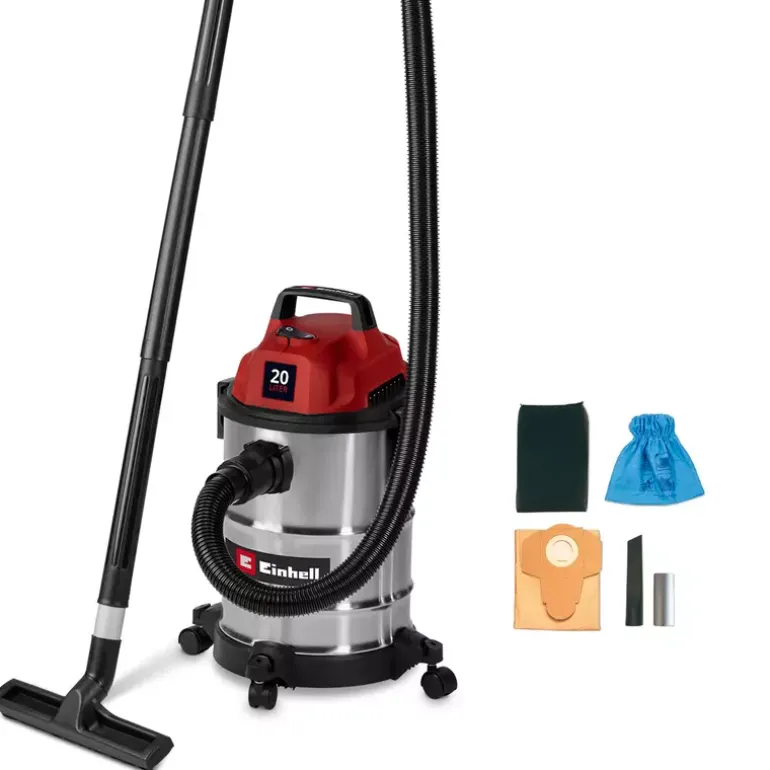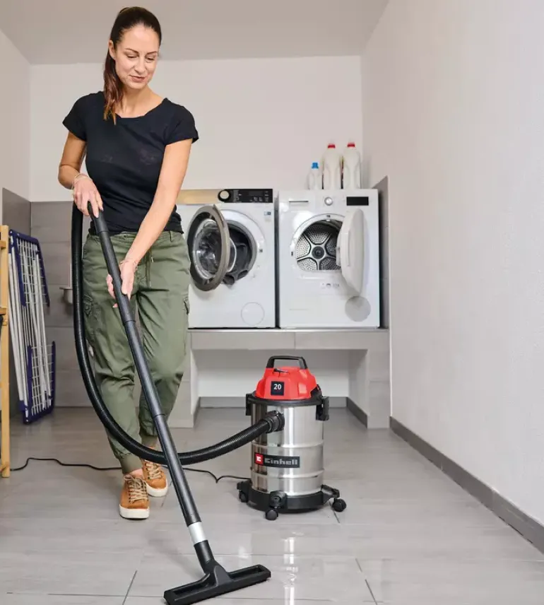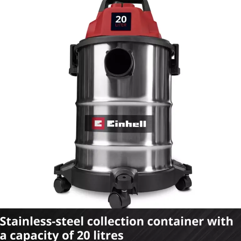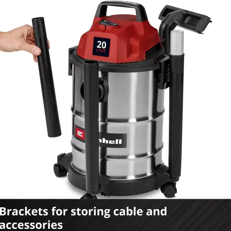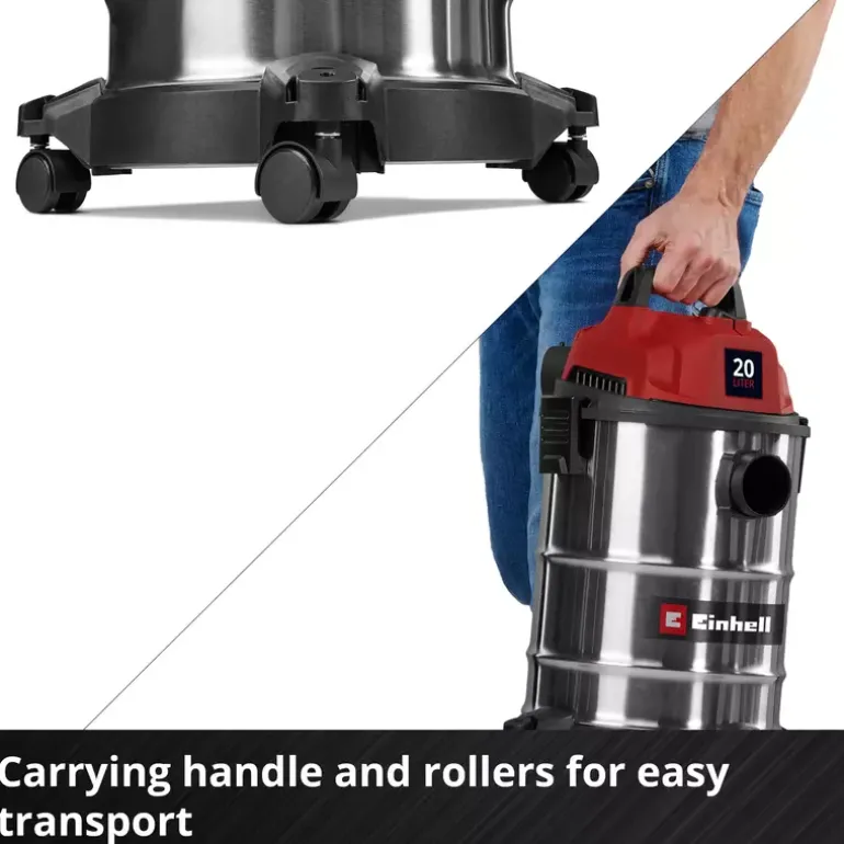 The Einhell wet/dry vacuum cleaner TC-VC 2045 S is perfectly suited for thorough cleaning around the house, workshop and garage. With 900 W of power and a suction capacity of 180 mbar, it reliably removes dust, dirt and liquids from a wide variety of surfaces. Even hard-to-reach areas can be easily cleaned when using the blowing connection. The wet/dry vacuum cleaner is fitted with a robust stainless steel container with a 20 litre volume. A 1.5 m long plastic suction hose (Ø 36 mm) and the 3-piece plastic suction pipe provide for a large range of action with high air flow throughput for cleaning. You can use the 3 m long power cable to extend this range of action up to 4.5 m. You can wind the power cable directly onto the vacuum cleaner cable holder for storage. With its four rollers provided and integrated carrying handle, you can use this wet/dry vacuum cleaner on the move. The vacuum cleaner is supplied with a crevice nozzle for cleaning narrow passages and a large combi nozzle for carpeting and hard floors. There is also a foam filter for wet cleaning plus a dirt collection bag and filter bag each for dry suction included.