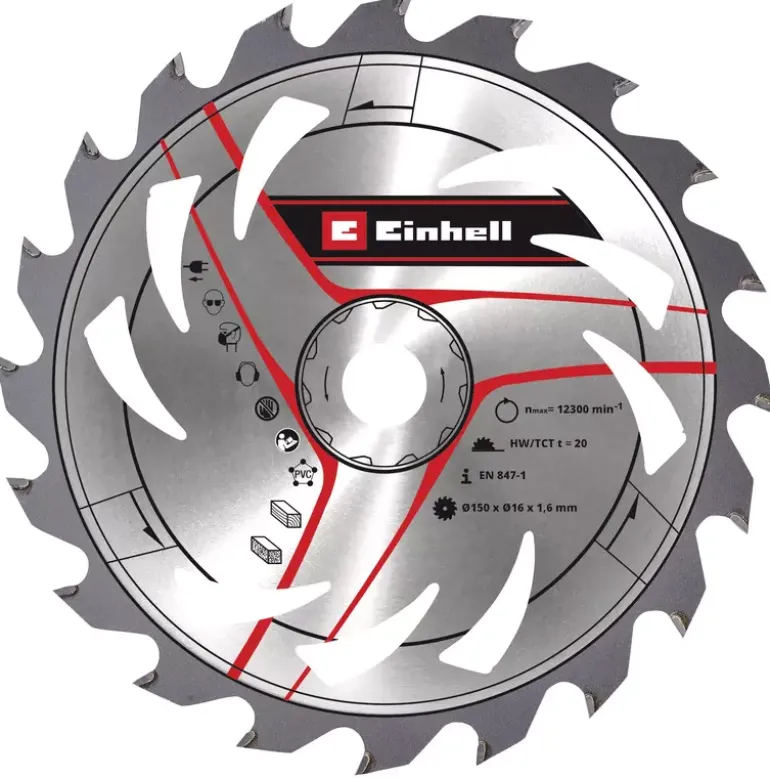 The Original Einhell circular saw blade has a diameter of 150 mm and is equipped with a 16 mm bore. The tungsten carbide-tipped saw blade has 20 saw teeth with a cutting width of 1.6 mm, and is suitable for processing hardwood, softwood, plywood, materials similar to wood and for PVC materials. With its spring-set teeth, the circular saw blade works its way swiftly through the material, thereby ensuring a uniformly efficient cut. It can be used with the Einhell cordless hand-held circular saw TE-CS 18/150 Li or other appropriate hand-held circular saws.