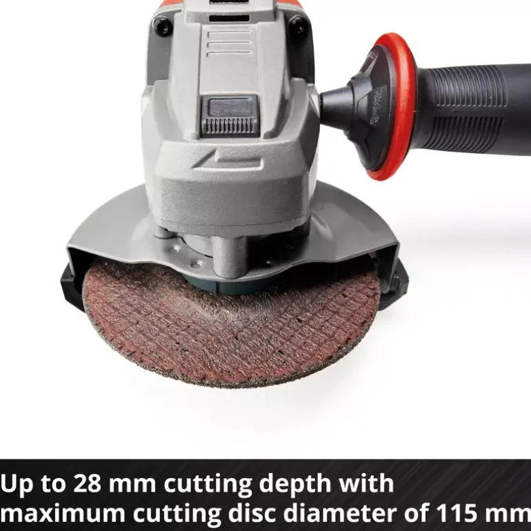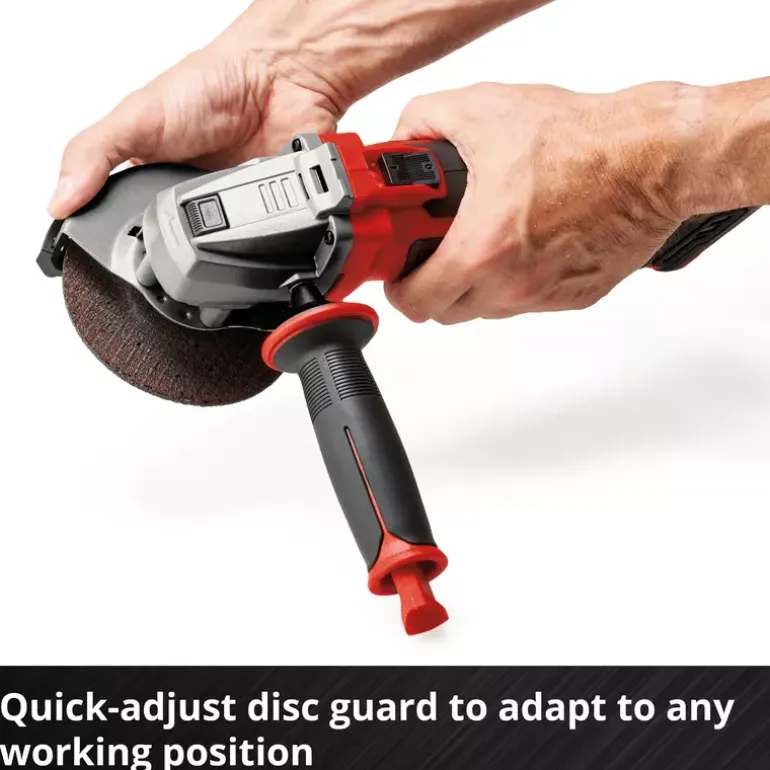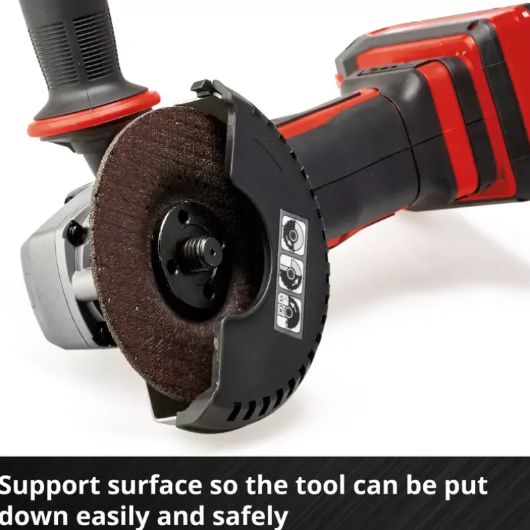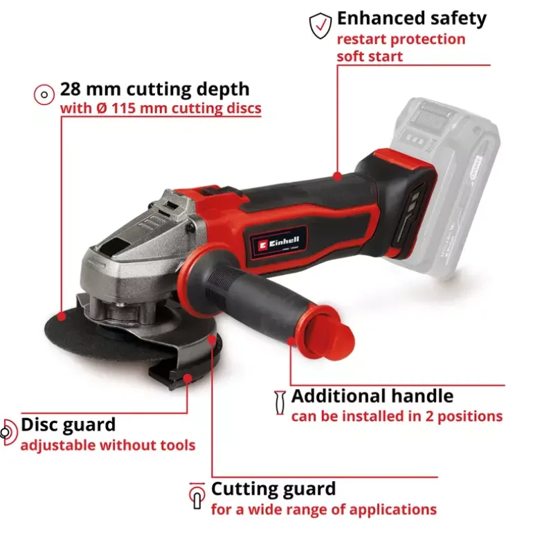 The Einhell Cordless Angle Grinder AG 18/115-2 Li – Solo is a tried and tested tool for cutting and polishing. Whether you’re working with metal or stone: The possible applications are endless. The angle grinder is part of the Power X-Change family; one 18 V battery is required for operation. The quick-adjust disc guard provides flexibly in application. The slim design enables comfortable operation, while the auxiliary handle can be flexibly mounted in two positions. The cordless angle grinder is suitable for a wide range of applications with its max. cutting depth of 28 mm when using cutting discs up to 115 mm in diameter. Soft-start and restart protection enhance user safety. The robust aluminium gearbox housing and the overload protection guarantee durability. A special raised support section allows the cordless angle grinder to be set down safely without the risk of it tipping over. With the supplied cutting guard, you will be ready to tackle a wide variety of jobs. Does not include battery, charger or cutting disc. These are available separately.