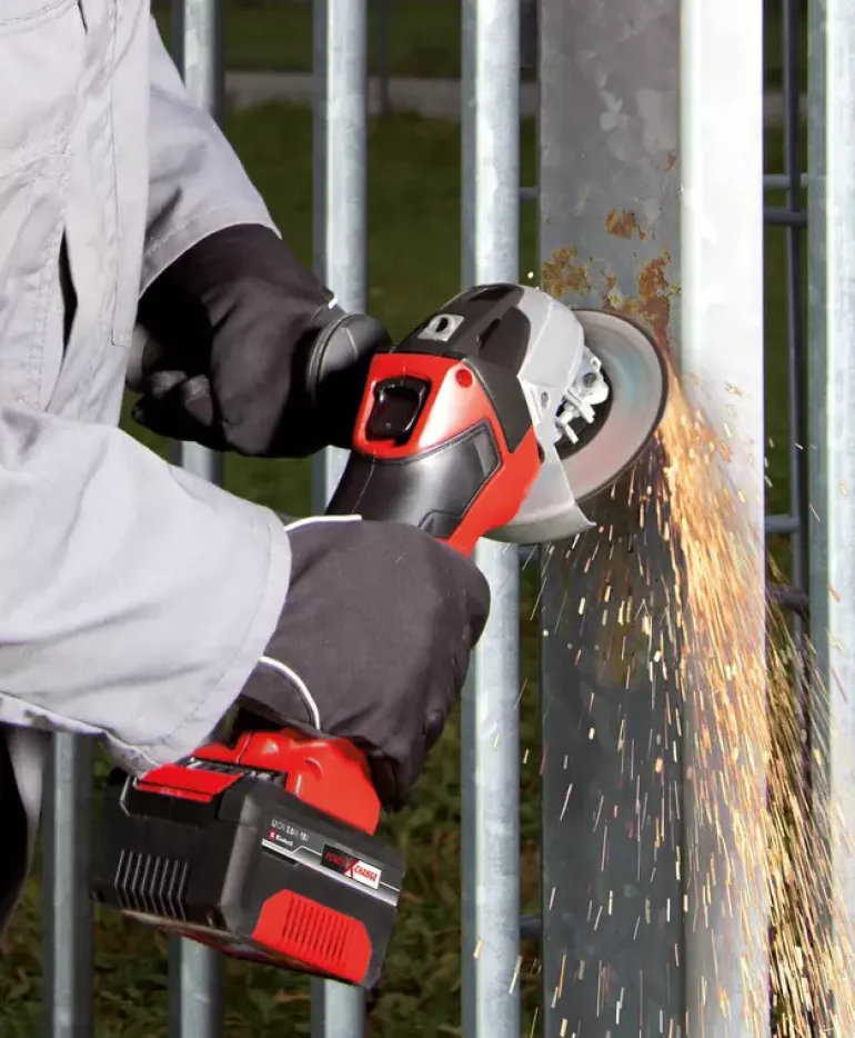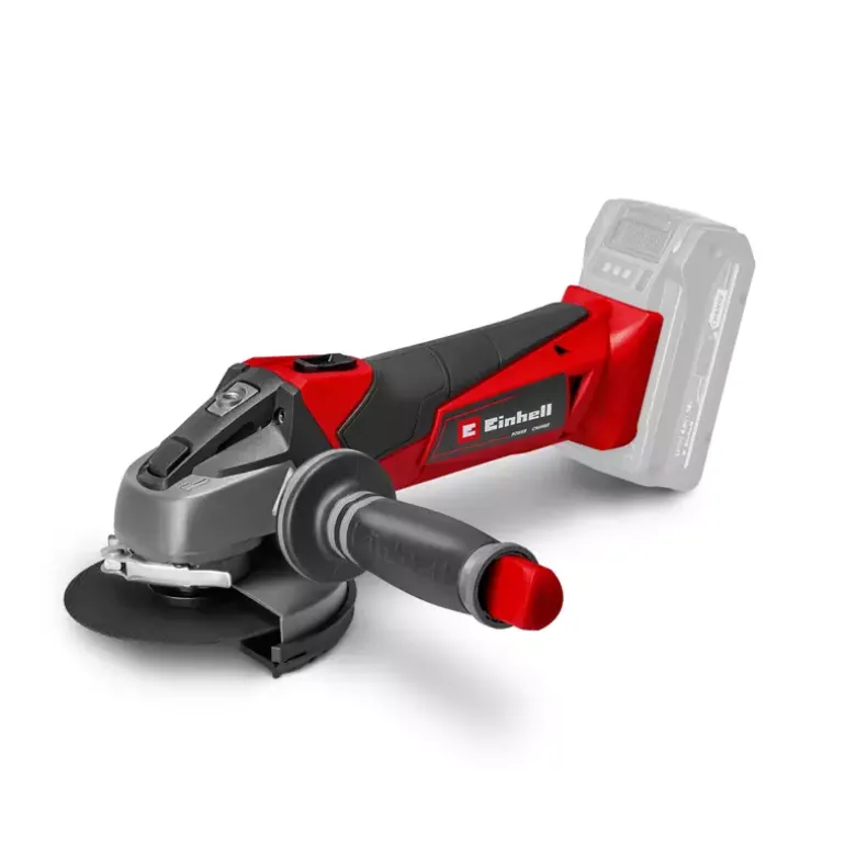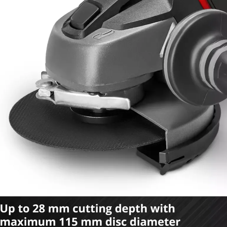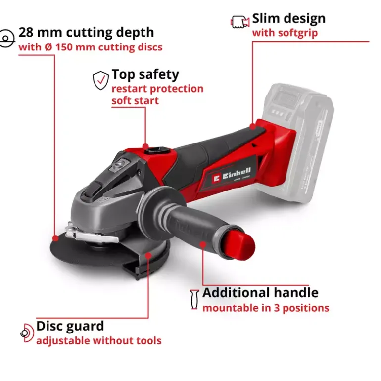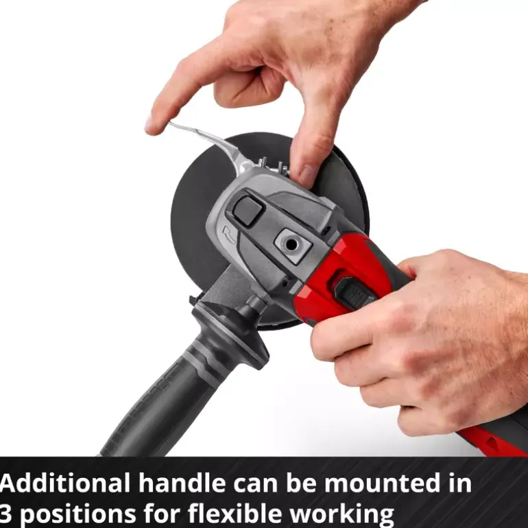 The Einhell cordless angle grinder TE-AG 18/115 Li – Solo is the lightest angle grinder in its class and features a robust aluminium gearing housing. It is a member of the Power X-Change family, so the batteries with the high-grade lithium-ion cells can be used for all members of the Power X-Change family. The battery and charger are available separately, for example as a high-performance starter set. For optimum cutting, grinding and roughing results it is recommended that a 2.6 Ah Plus battery or higher is used. Thanks to the softstart function and restart safeguard, the angle grinder starts up smoothly and is safer to use. With its slimline design with ergonomic soft grip and the additional handle which can be fitted in three available positions, the tool offers comfortable handling. The modified air guidance ensures optimum cooling of the tool and low strain on the gearing during operation. The disc guard comes with a quick-adjust facility which can be adapted with just a twist of the hand to any task. An overload cut-out contributes to greater safety and a longer service life. Supplied without a cutting disc.