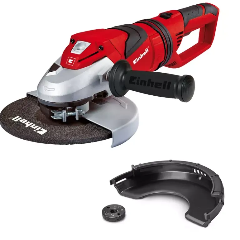 The TE-AG 230 angle grinder is a robust and powerful tool for real experts with exacting demands, which offers outstanding performance on challenging cutting, grinding and roughing jobs everywhere in the home, workshop and garage. The swiveling main handle ensures maximum flexibility for work. In addition the anti-vibration main handle damps vibrations, enabling you to work longer with less fatigue. A wheel guard with quick-adjust facility can be adapted with just a twist of the hand to any task, while the spindle stop permits easy and speedy tool change. A soft start function ensures that the tool starts up smoothly and safely. The TE-AG 230 features a flat sturdy metal gear head for excellent power transfer and low vibration operation, both of which help working in areas with difficult access. With its soft grip, anti-vibration main handle and swiveling handle, the angle grinder is easy to handle despite its immense power. The additional handle can be secured in three different positions for exact adaptation to the particular workpiece, thus ensuring a perfect hold for safe and speedy operation. A cable clip for securing the wound-up cable with just a twist of the hand keeps the TE-AG 230 neat and safe when stored away. The TE-AG 230 is supplied with a face spanner and cutting guard but comes without a cutting disc.