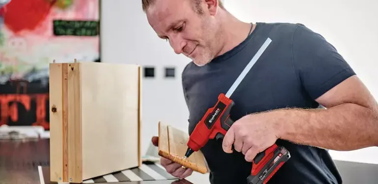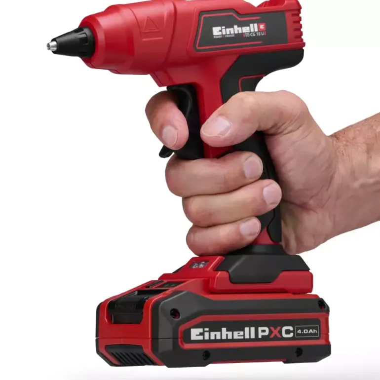 The Einhell TE-CG 18 Li – Solo cordless hot glue gun is the ideal helper for amateur craftsmen and DIY enthusiasts in the workshed and hobby room for performing precise glueing jobs, filling cracks and gaps, and even for sealing fractures and hairline cracks. As a member of the Power X-Change family from Einhell, the glue gun is powered by a high-performance and long-lasting lithium-ion rechargeable battery. This handy glue gun is ready for gluing after only a 120-second warm-up. The practical LED display shows the heat status at-a-glance. The glue gun switches off automatically after 5 minutes without being used to prevent overheating of the glue and the risk involved. The additional flat glue nozzle is ideal for jobs with specific requirements in narrow spaces, for example thin fractures or flat edges. For safe and comfortable handling the cordless hot glue gun has a softgrip. The cordless hot glue gun is supplied complete with five glue sticks (diameter 11 mm, length 200 mm). This product comes without a battery and charger which are available separately, e.g. as a practical Power X-Change starter set. As a member of the Power-X-Change family, all the rechargeable batteries from the system series can be used in the hot glue gun.