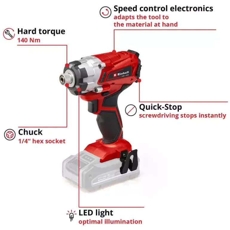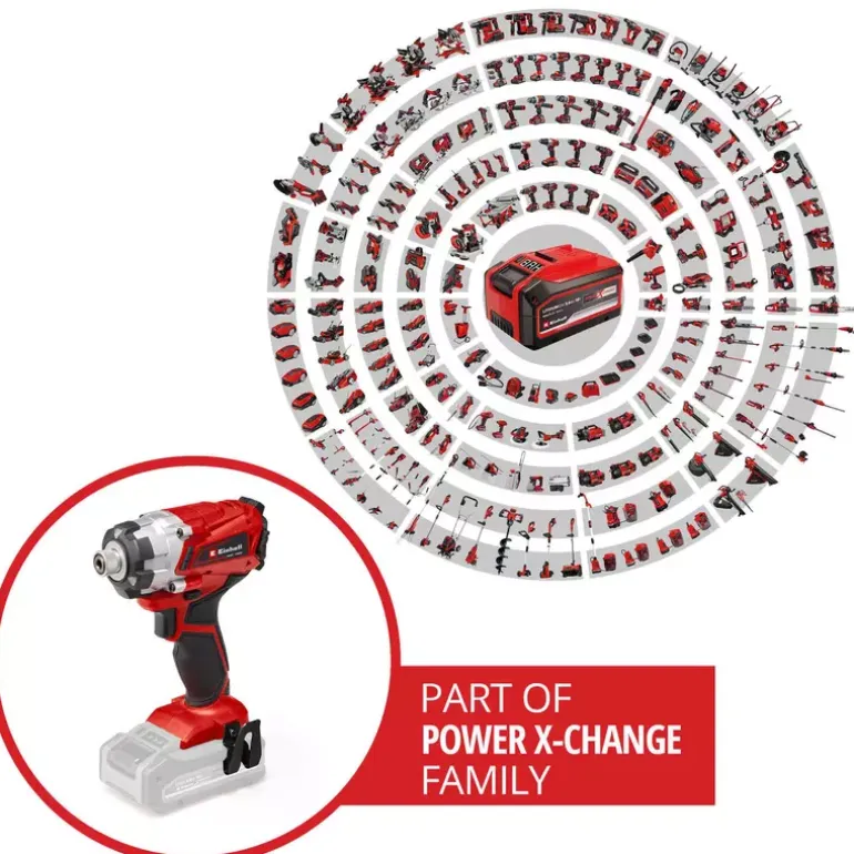 For performing work like a professional, the Einhell TE-CI 18/1 Li-solo cordless impact driver is the tool for the ambitious hobby DIY enthusiast. With 140 Nm the cordless impact driver not only effortlessly drives in large or long screws, it tackles filigree screwdriving jobs too: the cordless impact driver is suitable for a whole range of jobs in the home, the workshed and especially the garage. Unlike impact drill drivers, the impact driver from Einhell helps reduce physical strain on the user: the low reverse torque ensures that less effort is required compared to working with an impact drill driver. Also, the Einhell TE-CI 18/1 Li-solo cordless impact driver is a member of the Power X-Change family and can therefore be used with flexibility in any situation without any bothersome cables. The same battery for everything, a concept which means lots of other tools can also be operated with the same battery. Thanks to its short, light-weight design and ergonomic Softgrip surfaces, tireless working is assured. The Einhell TE-CI 18/1 Li-solo cordless impact driver is equipped with 6.35 mm (¼”) Hexagon Fitting for optimum operation with impact-resistant bits. The idling speed is 2300 rpm. The electronic speed control is finely adjustable for delicate operation. With the three power LEDs, Einhell has designed a tool which provides good allround illumination. An aluminium housing and rubber supports protect the housing and help make it a rugged machine. A practical belt clip is provided for efficient and safe operation. The rechargeable battery and charger for the Power X-Change range of products are available separately.