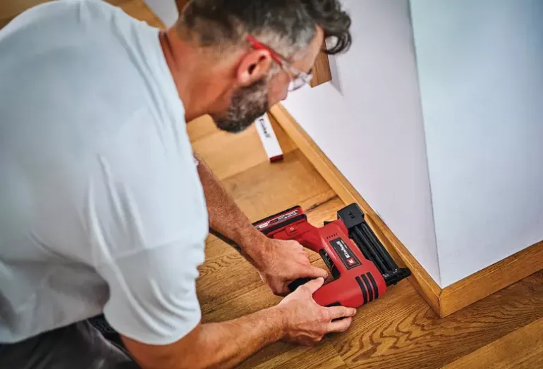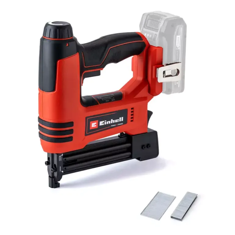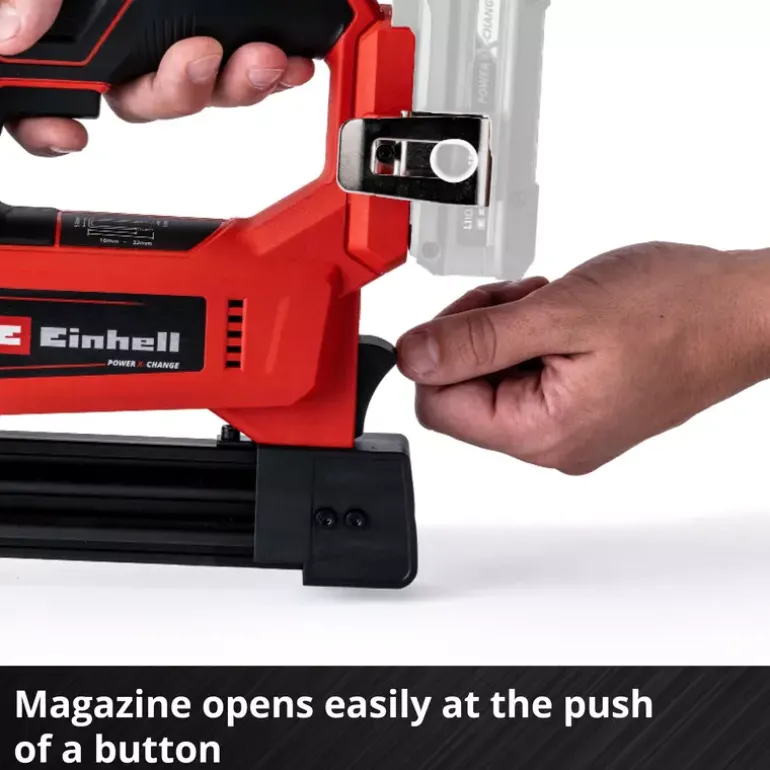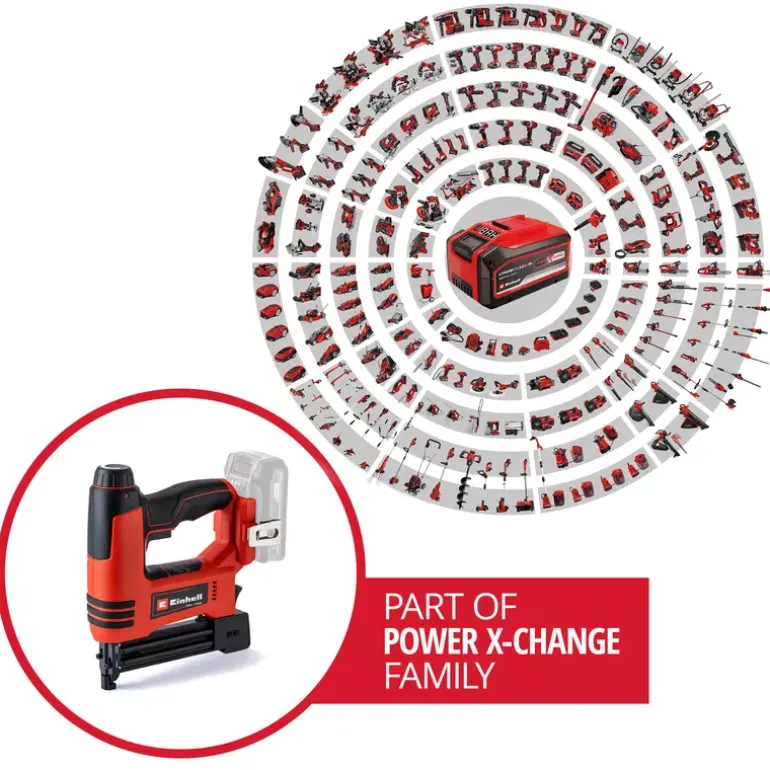 The cordless nailer TE-CN 18 Li-Solo is perfect for your garage or workshop and renovation work. Fixing objects with staples or nails is easy with stapler-nail gun combo. As a member of the Power X-Change family, the nailer can be operated with all batteries in the system series. The robust gearbox allows up to 20 impacts/min., while depth adjustment ensures variable impact depth. Working close to edges is possible thanks to the slim stapler nose. The magazine has a level indicator providing an overview of the current load and maximum capacity of 100 nails or clamps, all securely held by a magnet. It can be easily opened and refilled at the push of a button. The pressure mechanism on the stapler nose allows safe working, while large softgrip surfaces offer comfortable and firm hold. Delivery includes practical belt clip for safe storage and 300 nails (32mm) + 300 staples (19mm). With the supplied hexagon key, nail/staple jams can be easily and quickly fixed. Release protection prevents unintentional tacking/nailing, preventing injury. Batteries and chargers in the Power X-Change series are available separately, for example as a practical starter kit.