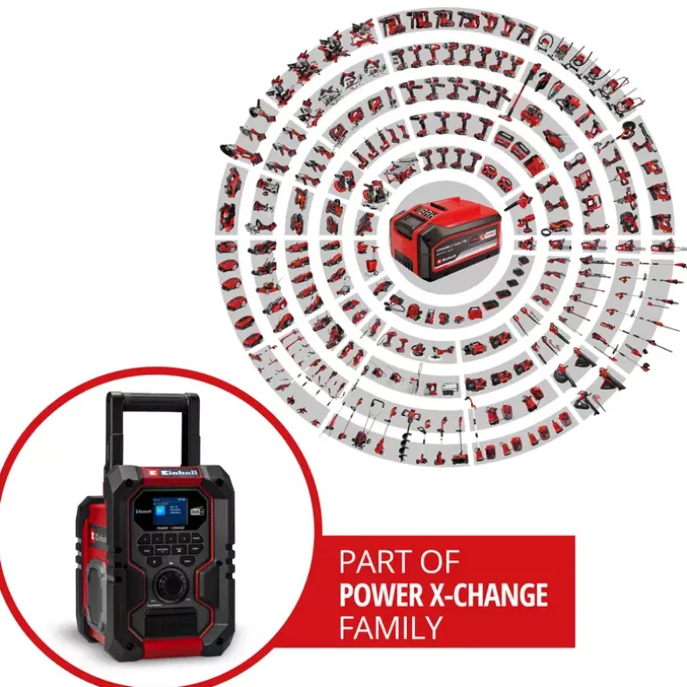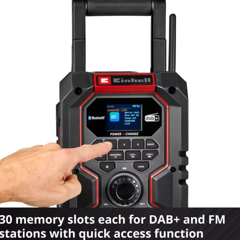 The Einhell cordless radio TE-CR 18 Li DAB+/FM/BT – Solo is a must-have for spreading good mood on any building site. This sturdy radio is a member of the Power X-Change family, where all batteries, system devices and chargers can be flexibly combined across the system. Alternatively, the radio can also be powered via the included 1.8 m long power cable. This cordless building site radio receives digital DAB+ and FM stations and you can store up to 30 stations each. An automatic search function makes it easier to find stations, while the RDS feature displays information such as song title, station name and traffic information directly on a crisp TFT colour display. Apart from receiving radio broadcasts, the device can also play music via Bluetooth, USB and AUX. In addition, external devices such as a smartphone can be conveniently charged via the USB-Out port. The built-in equalizer for fine-tuning the bass and trebles can create a custom sound experience. The sturdy housing with soft grip frame and the battery protector are certified in accordance with protection class IP65 and are therefore dust-proof and jet-proof – ideal for demanding environments such as building sites or for outdoor use. Two large speakers provide powerful stereo sound and the foldable shockproof aerial guarantees optimal reception. A built-in alarm clock with two adjustable alarm times, a sleep function for automatic switching off and a wide, foldable carrying handle provide a high level of comfort. The Einhell cordless radio TE-CR 18 Li DAB+/FM/BT – Solo is supplied without a battery or charger. These are available separately.