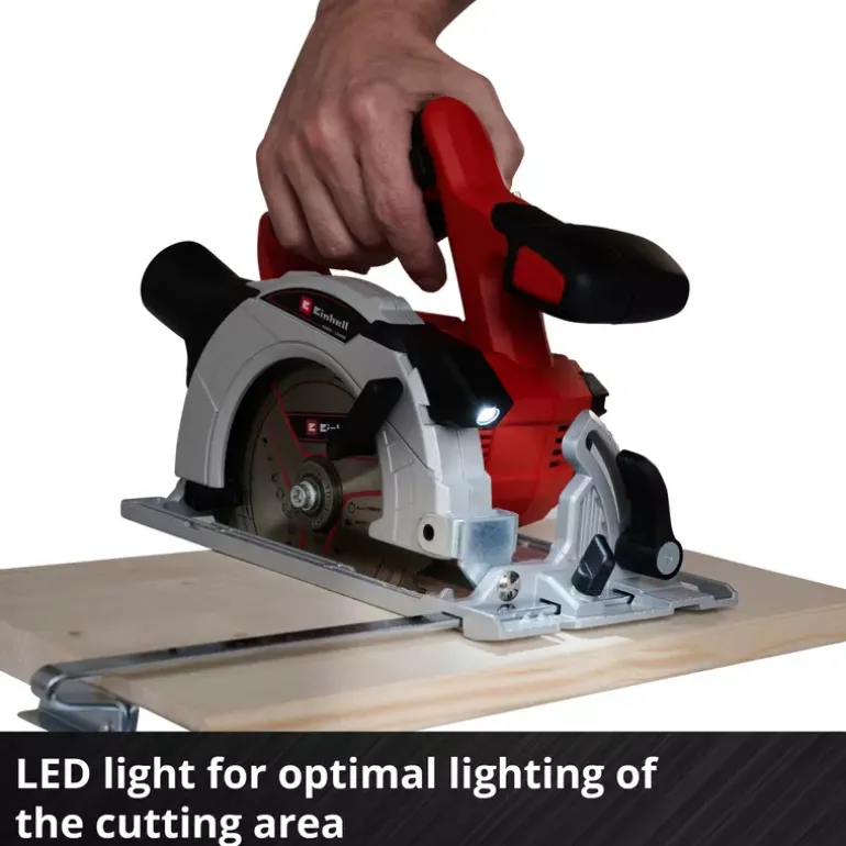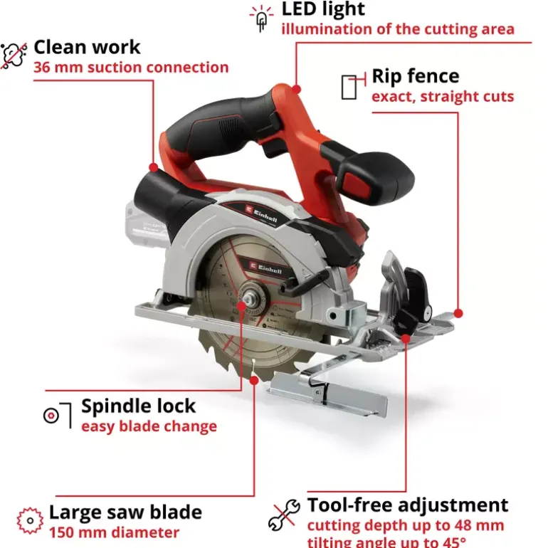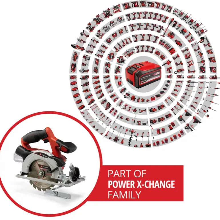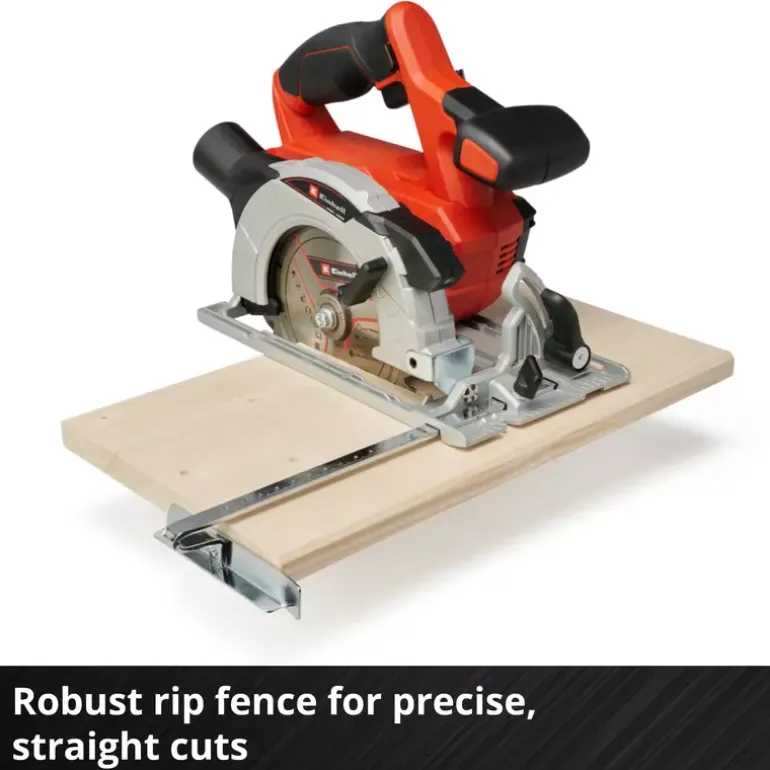 The Einhell cordless TE-CS 18/150 Li – Solo hand-held circular saw is compact, light and easy to work with. It is ideal when you need a handy tool anywhere around the home and garden. Because it is a member of the Power-X-Change family, you can take it anywhere work needs to be done. The same high-capacity batteries fit all Power X-Change tools. You can adjust the cutting depth and tilt angle on the cordless circular saw quickly and easily without any tools. A spindle lock makes it easy to swap sawblades with a 10mm or 16 mm bore. High-quality LEDs and a dust vacuum attachment give you a clear view of what you are doing and keep the work area clean. The TE-CS 18/150 Li – Solo cordless circular saw is compatible with the Einhell guide rail which is available separately. You can take Einhell cordless tools virtually anywhere without the need for a power source nearby. With lithium-ion technology, you can forget about tripping over tangled cables, places you can’t reach because the cable is too short and frustrating searches for an extension lead. The saw is supplied without a battery and charger which are available separately.