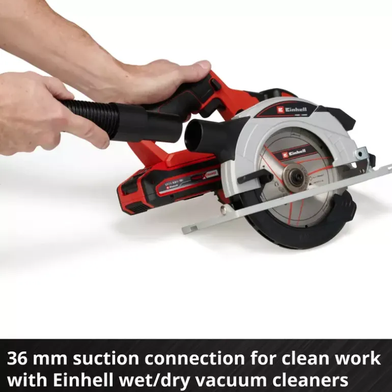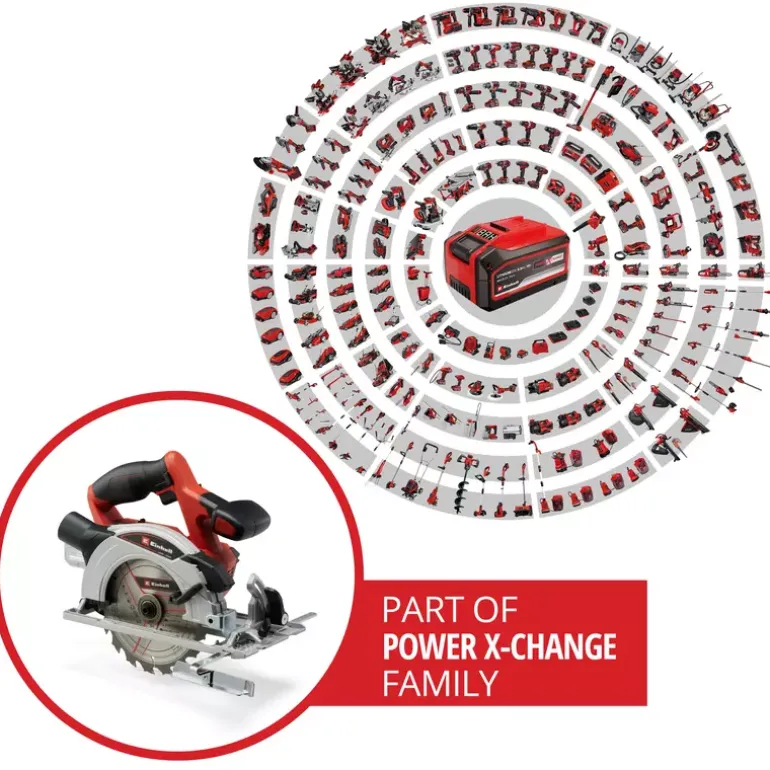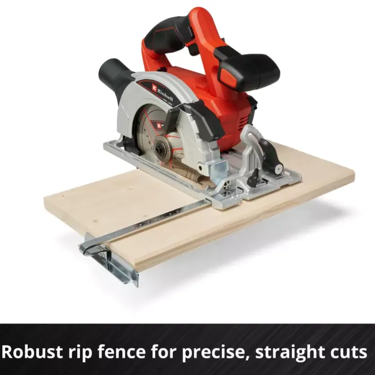 The Einhell cordless TE-CS 18/165-1 Li – Solo hand-held circular saw is compact, light and easy to work with. It is ideal when you need a handy tool anywhere around the home and garden. Because it is a member of the Power-X-Change family, you can take it anywhere work needs to be done. The same high-capacity batteries fit all Power X-Change tools. You can adjust the cutting depth and tilt angle on the cordless circular saw quickly and easily without any tools. A spindle lock makes it easy to swap sawblades with a 20mm bore. High-quality LEDs and a dust vacuum attachment give you a clear view of what you are doing and keep the work area clean. The TE-CS 18/165-1 Li – Solo cordless circular saw is compatible with the Einhell guide rail which is available separately. You can take Einhell cordless tools virtually anywhere without the need for a power source nearby. With lithium-ion technology, you can forget about tripping over tangled cables, places you can’t reach because the cable is too short and frustrating searches for an extension lead. The saw is supplied without a battery and charger which are available separately.