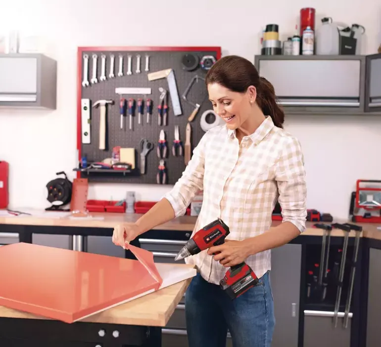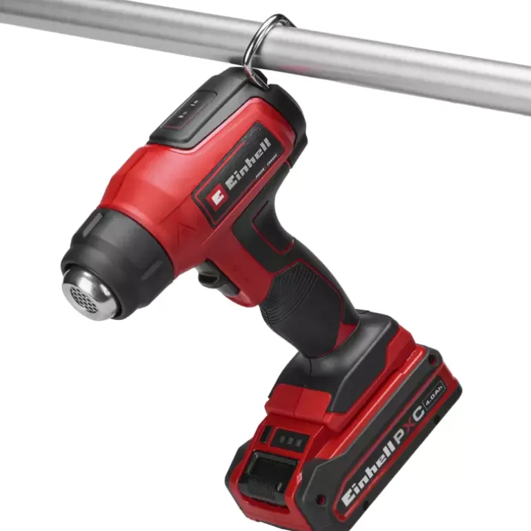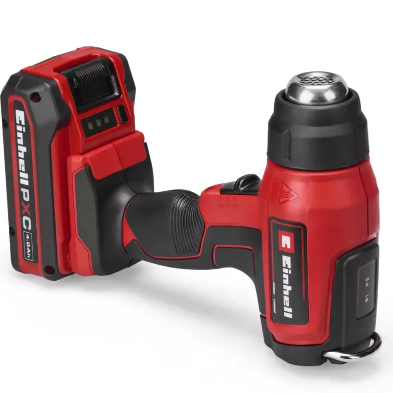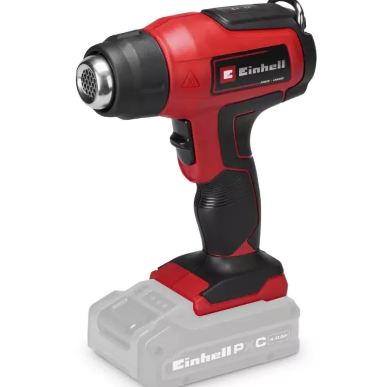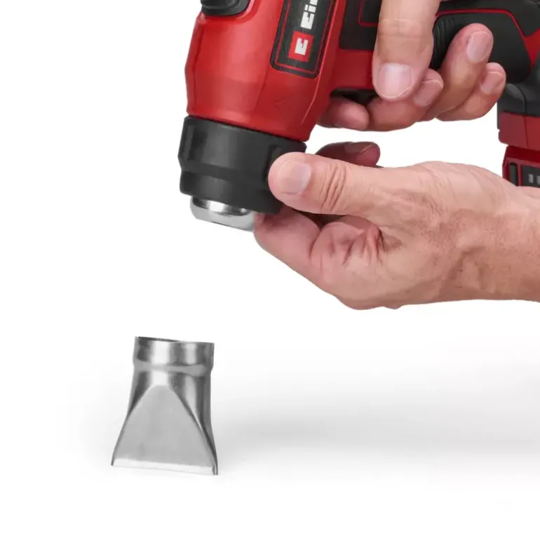 The Einhell cordless hot air gun TE-HA 18 Li-Solo is a flexible member of the impressive Power X-Change family. The powerful hot air gun has two temperature levels: For the gentle shaping of plastics in model making, for the removal of adhesive films or also for old paints, adhesive residues and paint layers. The selected temperature level can be seen at a glance on the LED display. Overheating protection ensures safe operation. The mechanical nozzle ejection makes it easy to remove the supplied redirection nozzle, wide jet nozzle and reflector nozzle. The storage area is suitable for stationary use and a retractable metal hook is used for flexible work and storage. The ergonomic handle with softgrip ensures a firm, secure grip. Delivery does not include a battery or charger (available separately).