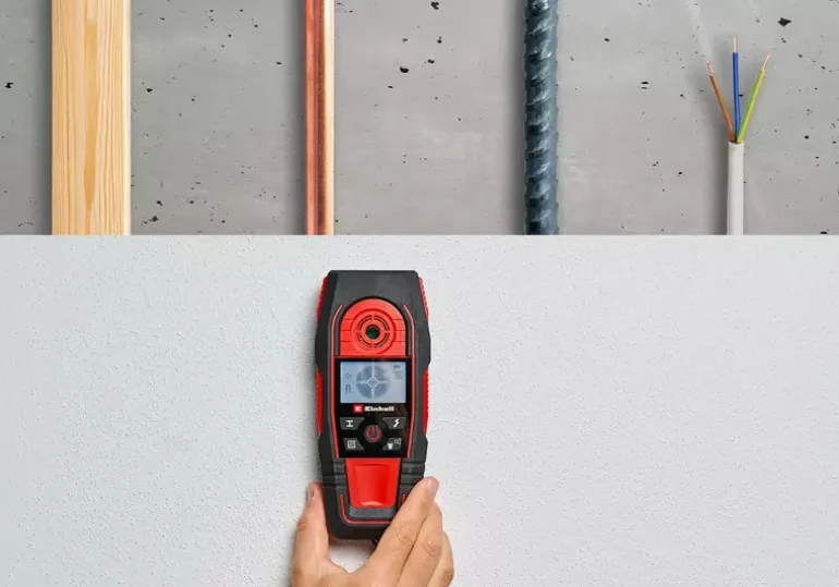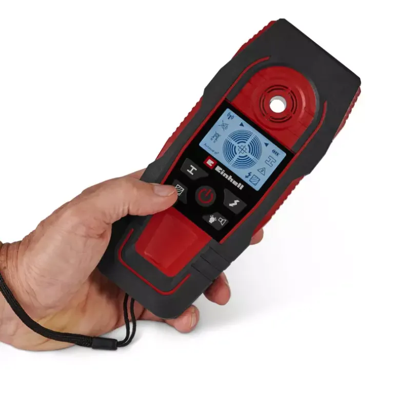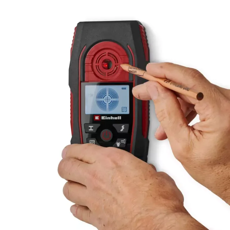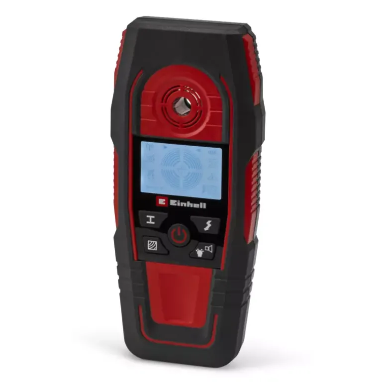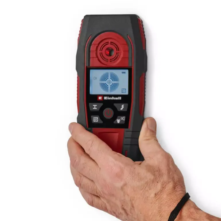 The Einhell Digital Detector TE-MD 80 is an indispensable aid for every DIY enthusiast and professional tradesperson. Before drilling into a wall, the detector allows precise checking of whether the selected spot is safe to drill. The digital detector indicates the position of metals, wood, and live electrical cables within the wall. Ferrous metals such as steel can be detected up to a depth of 80 mm, live cables up to 60 mm, non-ferrous metals such as copper up to 38 mm, and wood up to 24 mm. The detection results are clearly signalled by an acoustic warning, the easy-to-read LCD display, and the light ring. When the ring around the centring opening lights up green, no obstacle has been found. The desired drilling spot can then be marked through the marking opening. If the ring turns orange, the detector is approaching an object, and it lights up red when the centring opening is placed directly above the detected object, such as a metal beam. The operating mode can be selected quickly and intuitively via the integrated buttons. Handling the device is particularly easy thanks to the automatic calibration. A protective slider on the back of the housing ensures protection for the wall during use. The compact design with soft grip surfaces and the included wrist strap enable comfortable one-handed operation. If the digital detector TE-MD 80 is put aside, it switches off automatically after one minute of inactivity to conserve the battery. The device requires one 9 V battery for operation (not included).