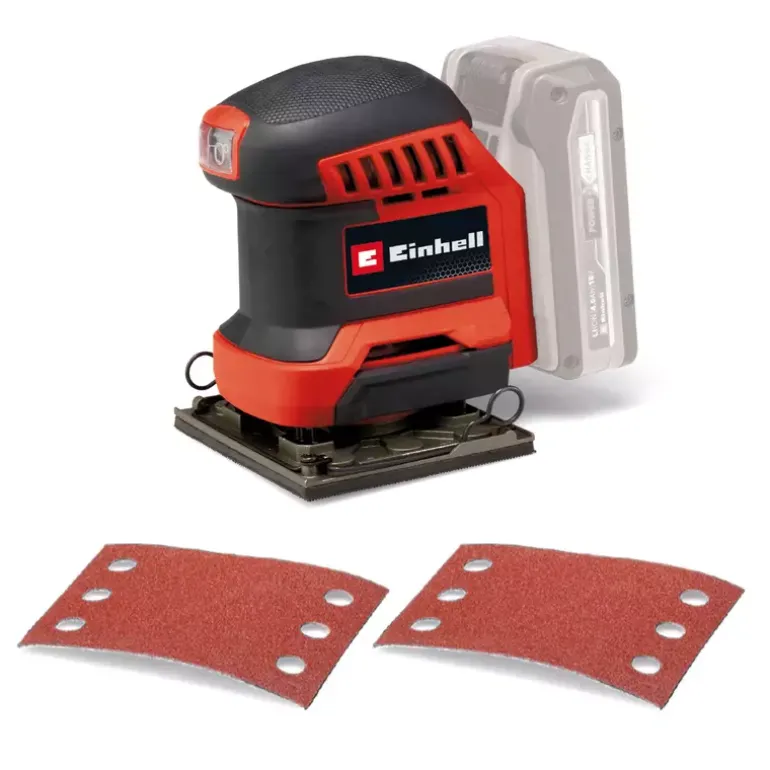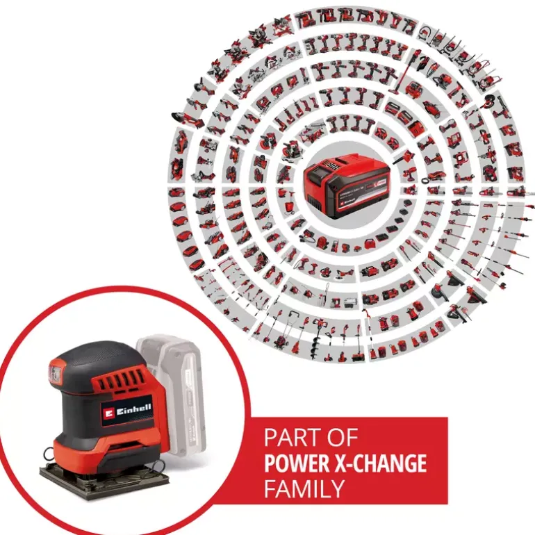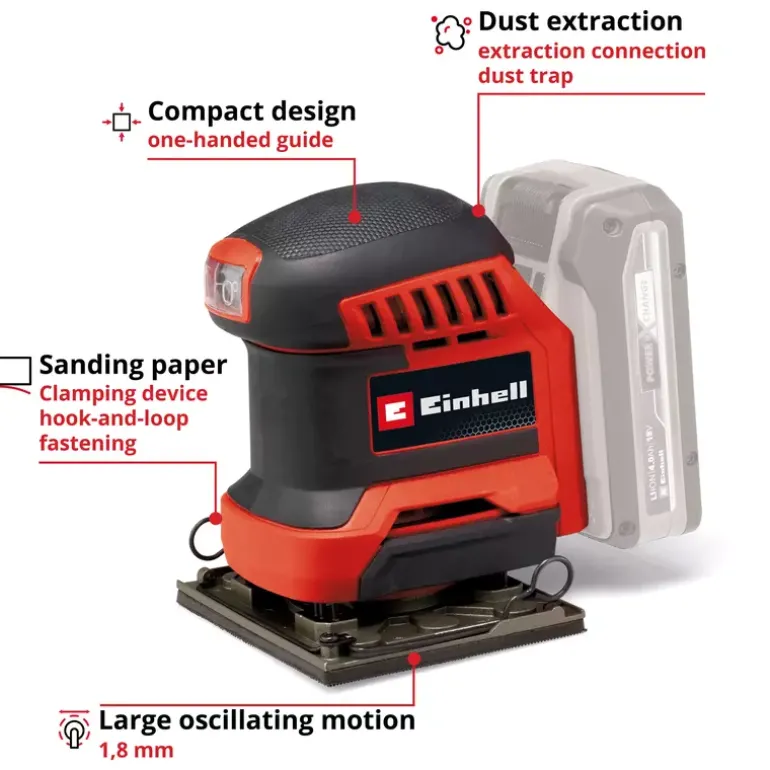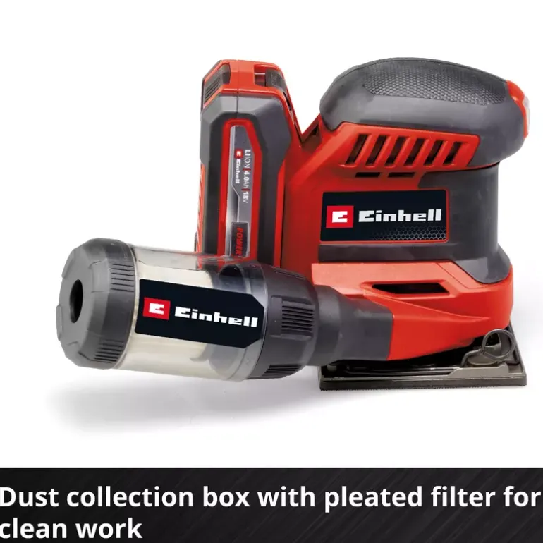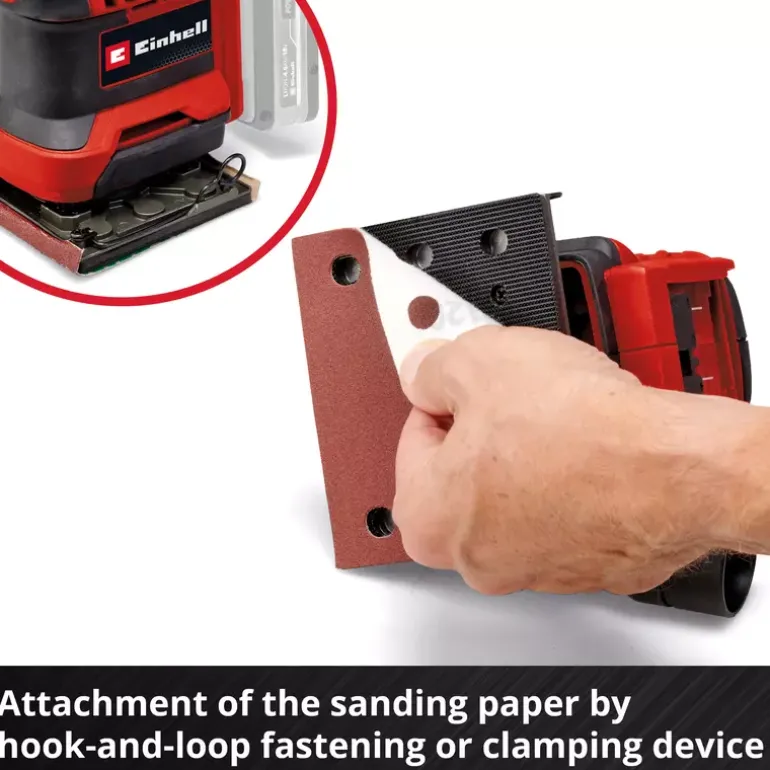 The Einhell cordless palm sander TE-OS 18/113 Li-Solo is a compact, powerful member of the flexibly combinable Power X-Change family. Due to the 1.8 mm oscillating circuit, the powerful cordless palm sander is ideal for sanding flat surfaces made of wood and wood-based materials and, for example, abrades paint or varnish in no time. It is supplied with an already mounted sanding plate (101 x 113 mm) and 2x sandpaper (P120). The sandpaper can be exchanged quickly with the help of hook-and-loop fastening and fixed without wrinkles. A clamping device is also integrated for attaching standard sandpaper. To keep the work area clean, the orbital sander has an integrated dust extraction system with dust collection box and removable pleated filter. Alternatively, an external suction system, for example an Einhell wet/dry vacuum cleaner, can also be attached to the extraction connection. The on/off switch is dust-proof. Its compact design with softgrip surfaces ensures comfortable use and optimal guidance of the orbital sander. The TE-OS 18/113 Li-Solo cordless palm sander is supplied without a battery or charging device. These are available separately.