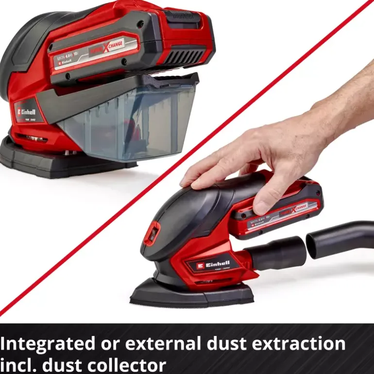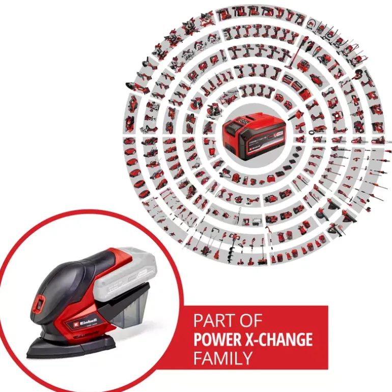 The cordless multiple sander TE-OS 18/150 Li – Solo comes with the “Extreme Fix” hook and loop fastening so that the abrasive paper can be changed in seconds and then deliver a high rate of material removal due to low slippage. For clean, practically dust-free working there is a dust collection box with active dust extraction. Using the dust extractor adapter the box can be replaced by a vacuum cleaner for drawing off the grinding/sanding dust directly – in this way the air remains clean and the abrasive paper sharp. The rugged aluminum fan impeller ensures that the sander runs smoothly to deliver optimum results. Six sheets of abrasive paper for wood are included so that you can begin work immediately. The tool is supplied without battery and charger. These are available separately. In addition, the tool can also be run using a battery from another tool from the Power X-Change family.