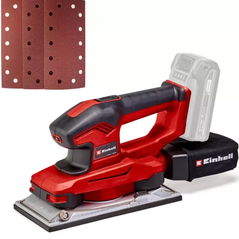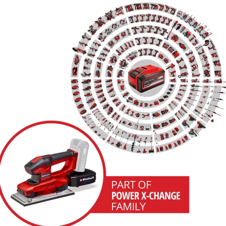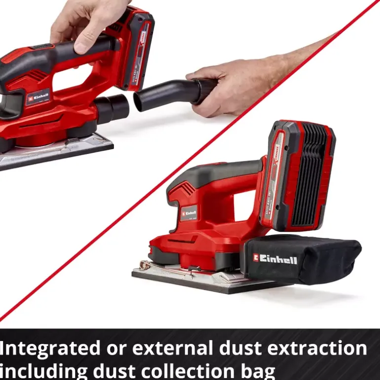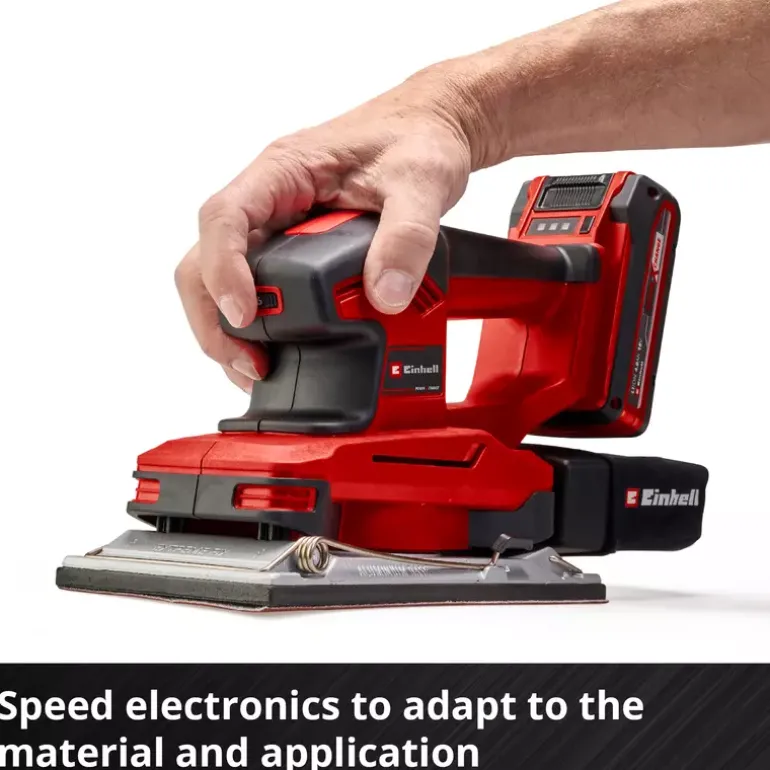The Einhell cordless orbital sander TE-OS 18/230 Li Solo is a powerful member of the flexible and infinitely combinable Power X-Change family from Einhell. The robust, powerful orbital sander is perfectly suited for sanding flat surfaces such as workpieces, wooden planks or panelling and cladding. The speed is adapted to the material and application by the speed electronics. Thanks to the micro hook and loop fastening and clamping device, the abrasives on the robust and durable aluminium base plate can be changed quickly and easily. The grip surfaces, which are equipped with softgrip, offer a firm and secure grip. The dust collection sack collects any sanding dust produced. There is also the option to connect a vacuum cleaner for maximum cleanliness on the work surface. Delivery includes three sandpapers, so you can start your project immediately. Battery and charger (sold separately) are not included.