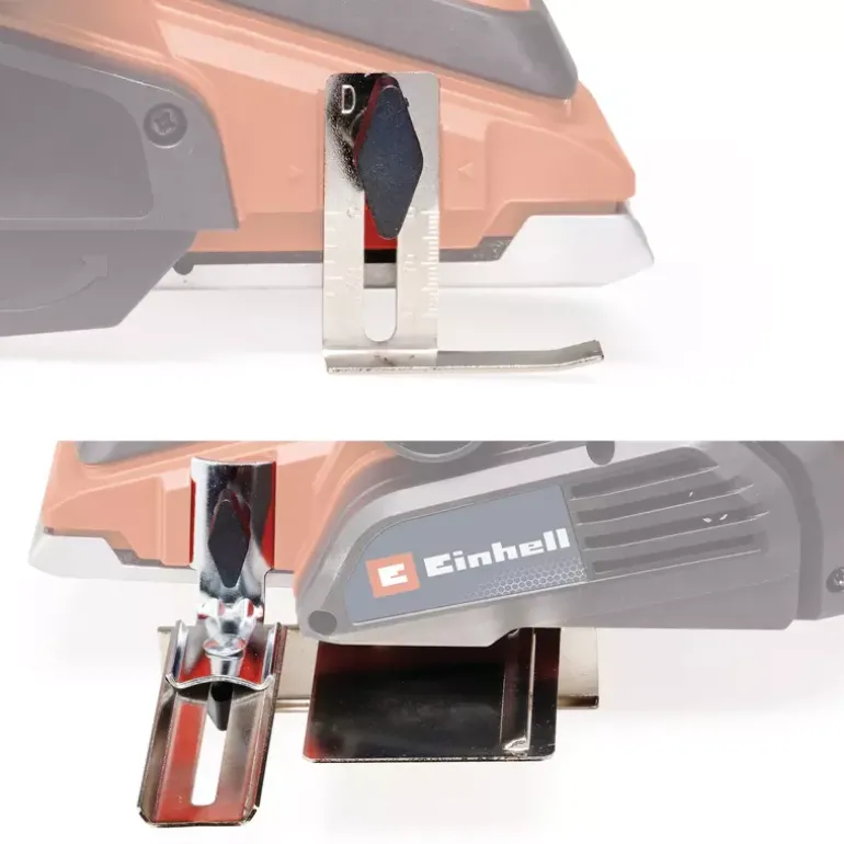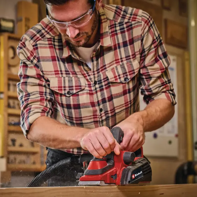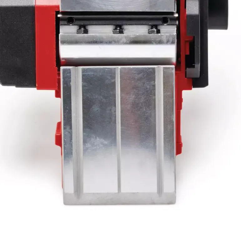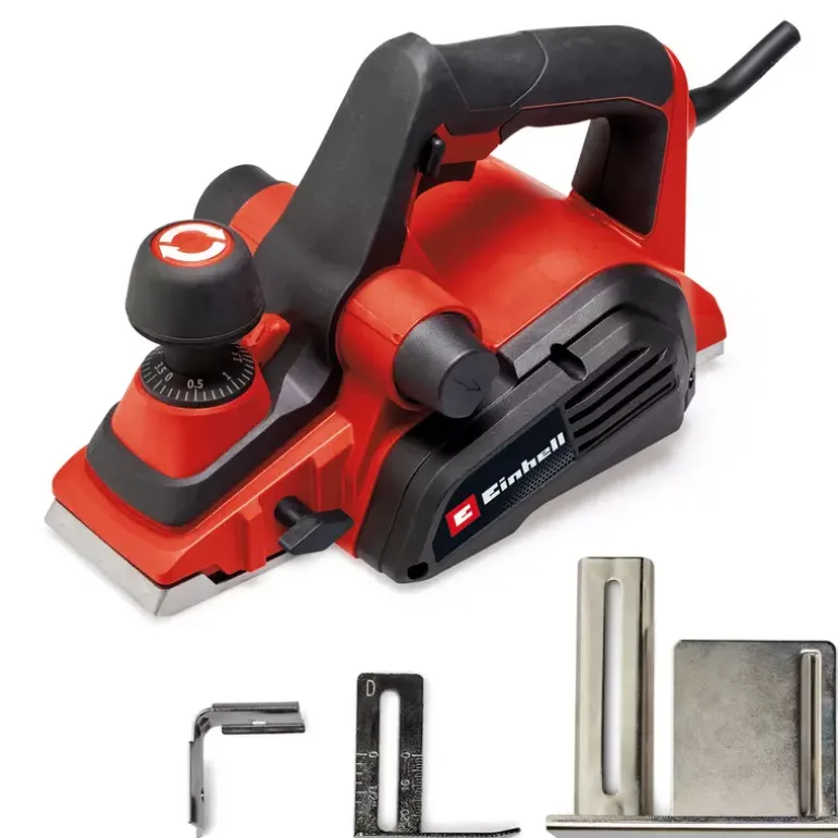 The Einhell TE-PL 920 electric planer is a powerful hand planer for applications requiring cutting depths of up to 3.5 mm. A large blade shaft, 920 watts of power and a planing width of max. 82 mm ensure optimal planing results. The chip ejection can be selected on two sides and the supplied suction adapter with a diameter of 36 mm can be attached to it. This means that all suitable Einhell wet/dry vacuum cleaners can be used. The solid and flat aluminium base plate ensures smooth and precise work results. The base plate is also equipped with three V-grooves for easy chamfering of edges. With a folding depth of 18 mm and a folding depth stop, straight and clean heels can be produced. The automatic parking shoe protects both the workpieces and the planer blades. The ergonomic handle offers a secure and firm grip for fatigue-free work, even for longer use, and softgrip surfaces for comfortable handling. Included in the delivery is a rip fence for straight and precise planing work as well as two durable TCT planer blades (reversible blade).