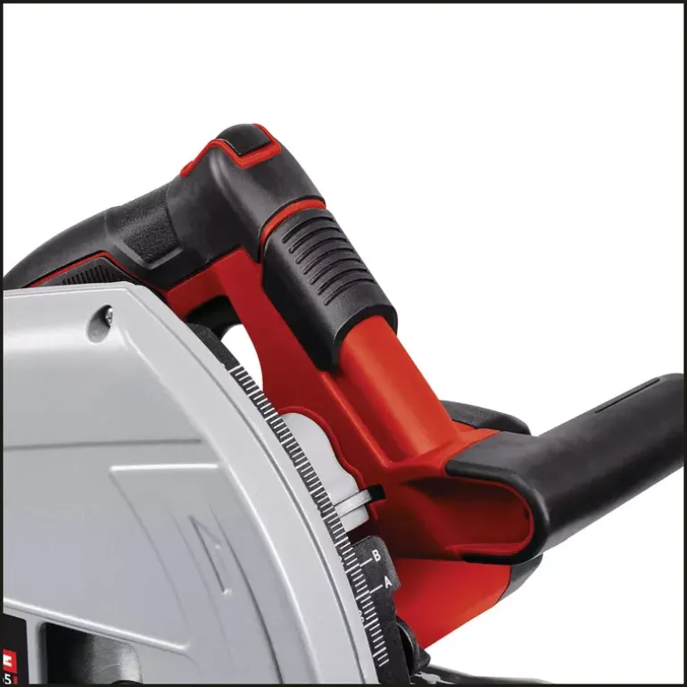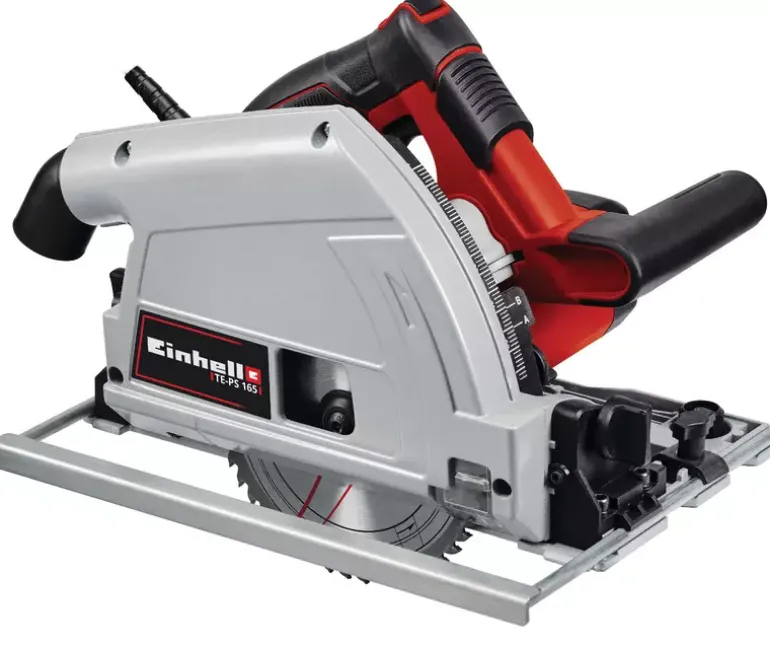 The Einhell plunge saw TE-PS 165 is a powerful all-rounder when precise cuts are to be made in a wide variety of materials. Whether wood, panels or plastics: The high-quality carbide saw blade works with up to 1,200 W power through materials up to a cutting depth of up to 56 mm (at 90° without rail). Even in an oblique cut of up to 45°, depths of up to 42 mm (without rail) are not an obstacle. Clean cuts are also guaranteed in the area of use close to the edge. The cutting depth and angle of inclination can be adjusted without tools and easily. The blade lock allows an easy change of the saw blade. The viewing window ensures better visibility in the cutting area. The cable length offers a particularly large operating radius of up to four metres. The rip fence ensures straight work results. Thanks to the vacuum cleaner adapter, the workplace remains clean. The large handle was designed for fatigue-free work with the Einhell plunge saw. The guide rail system, which is available separately, ensures even more precision. Special plastic holders are intended for fine adjustment of the guide rail.