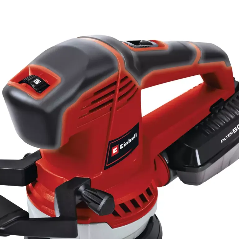 The eccentric sander TE-RS 40 E is a solid, powerful tool which provides good service to DIY enthusiasts on sanding jobs involving wood, plastic and metal. Thanks to the electronic speed control, the sanding power can be well adapted and is perfect suited for high sanding performance and fine-tuning tasks. The TE-RS 40 E is equipped with mirco-hook and loop fastening so that the sanding paper can be changed in seconds and sits crease-free on the sanding disk. The ergonomic, rubberized handle and the additional handle provide a good hold during sanding and ensure comfortable handling even during long work sessions. For clean, low dust operation the tool works with an active dust extraction with filter box.