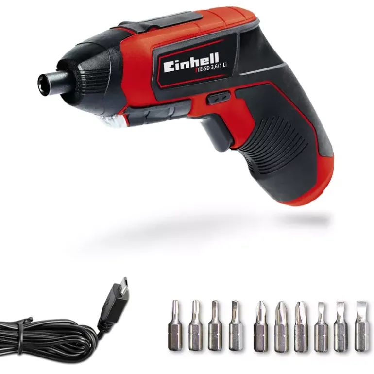 The Einhell TE-SD 3.6/1 Li cordless screwdriver is not only good to hold, it delivers its full power at the touch of a button. Bits can be changed quickly and intuitively thanks to the 6.35mm/¼” magnetic bit holder. For optimum operation in dark areas there is integral LED lighting. Exceptionally easy handling and working without tiring, even on prolonged assignments, is ensured by the ergonomic design and Softgrip. The cordless screwdriver is equipped with a set of 10 bits and is therefore ready for immediate action. For maximum durability there is a robust metal gearing. The cordless screwdriver is always ready-for-use thanks to the lithium-ion technology without self-discharge. The product is supplied with a 3.6 V/1500 mAh rechargeable battery with an advanced charging mechanism with the Micro USB charger.