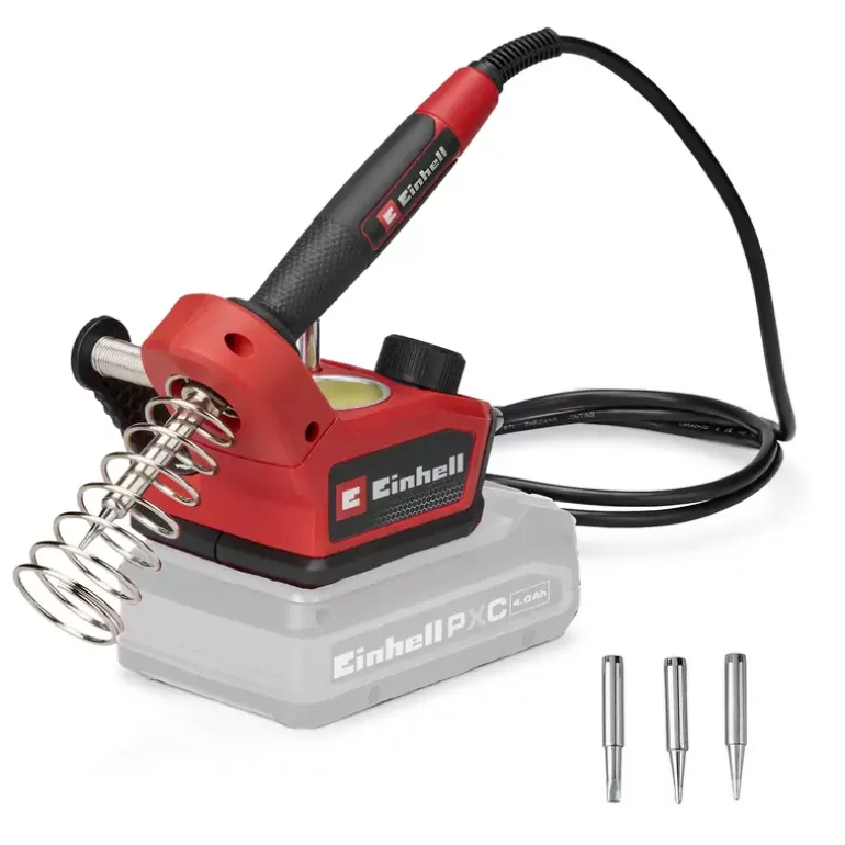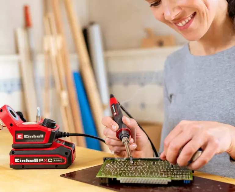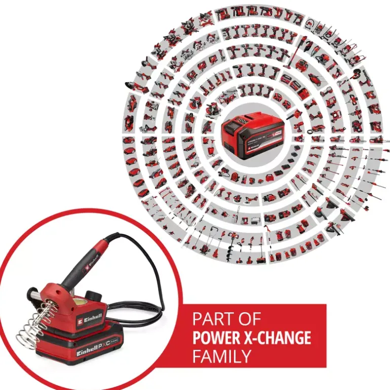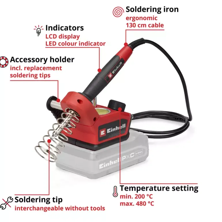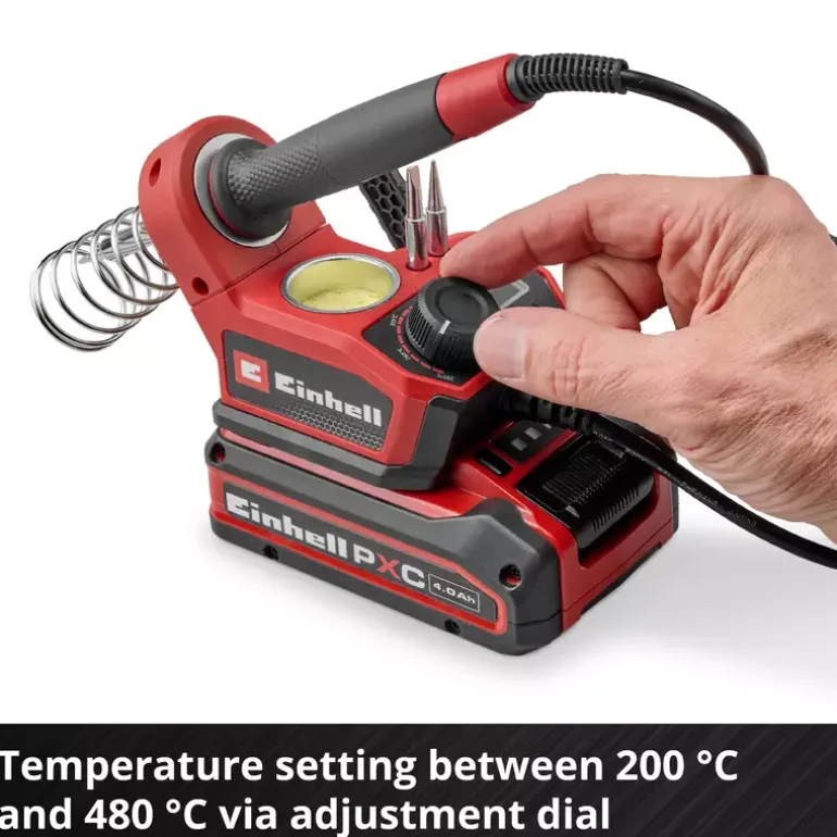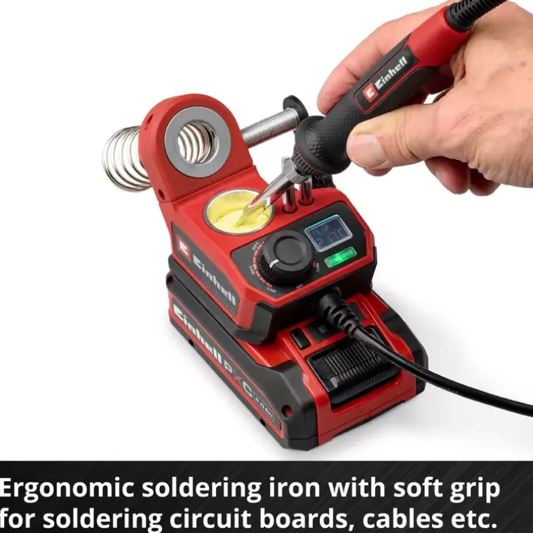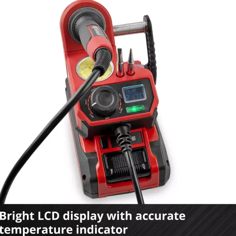 The Einhell cordless soldering iron TE-SI 18/480 Li E – Solo offers maximum mobility for precise soft soldering. As part of the Power X-Change family, the cordless soldering station enables flexible working without a power socket. With a temperature from 200° C up to 480° C, it is ideal for soldering circuit boards, cables and wires. The desired temperature can be set via a large adjustment dial. A bright LED indicates the heating status while the LCD display indicates the exact temperature of the soldering tip. The soft grip surface of the ergonomic soldering iron ensures a safe grip during work. A holder with built-in contact protection ensures safety while the iron is cooling down. The soldering tip can be changed without tools once it has cooled down. The soldering iron kit comes with 2x pointed tips, 1x flat tip, solder (Ø 1,0 mm) and a cleaning sponge. In addition, a practical holder for the additional soldering tips is integrated. The device is supplied without battery or charger. These are available separately.